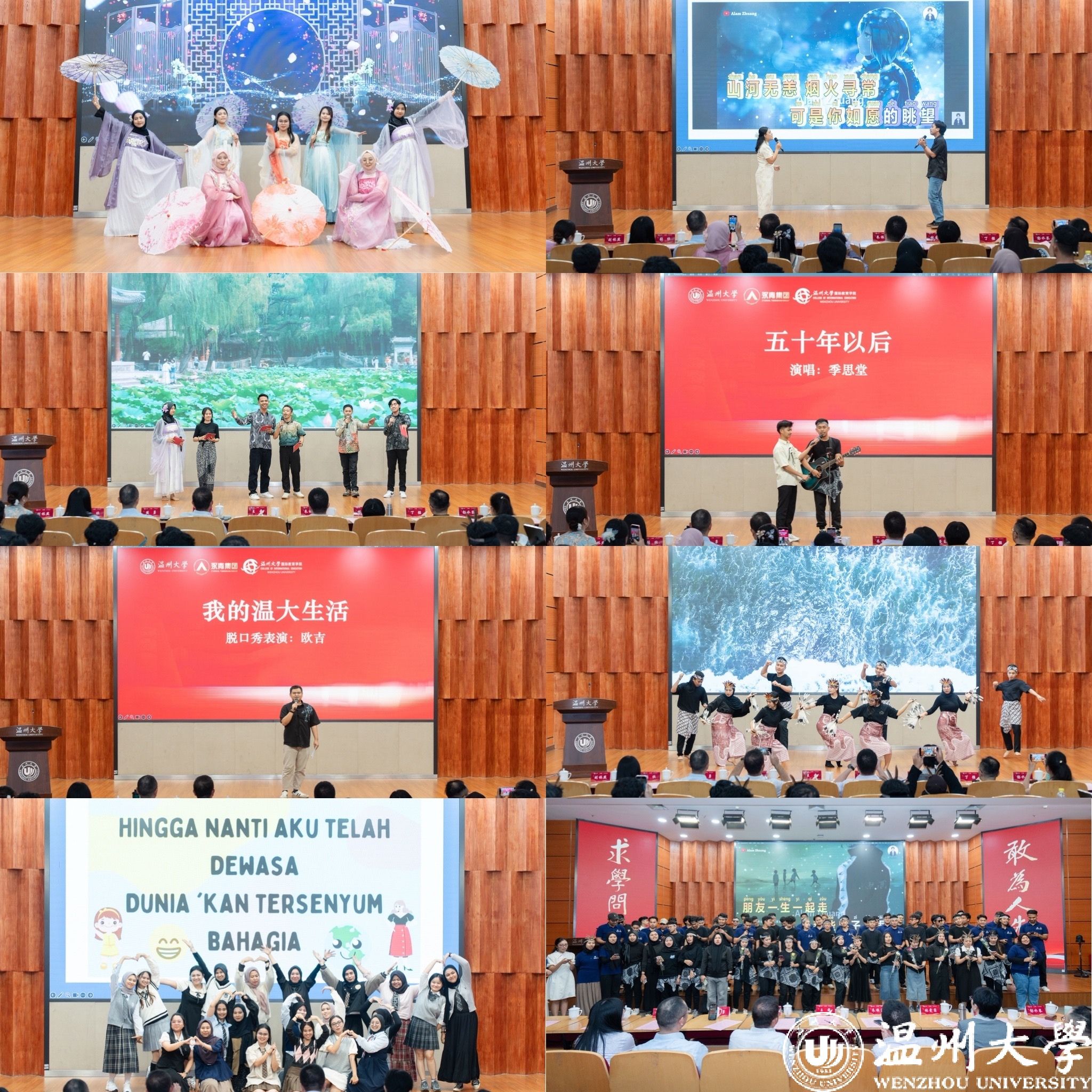 青山班学员们带来了一场精彩纷呈的汇报演出,以多元艺术形式生动展现了中印尼文化交流成果。中国传统文化节目《青花瓷》以优雅舞姿诠释东方美学,《如愿》合唱传递美好愿景,季思堂的独唱《五十年以后》深情动人;印尼特色节目《Nusantara》舞蹈和《Yamko Rambe Yamko》合唱则带来浓郁的异域风情。欧吉的脱口秀《我的温大生活》幽默分享学习趣事,林心恩等同学的朗诵《我喜欢出发》充满青春激情。最后全体合唱《朋友》将气氛推向高潮,真挚歌声既展现了学员们的艺术才华,更见证了他们在温大收获的珍贵友谊。
