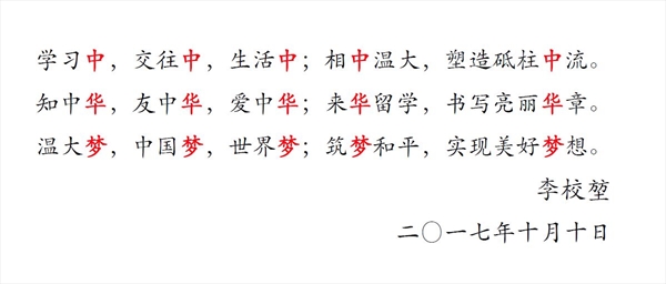 国际化工作的积极倡议者校长李校堃教授的悉心指导,他亲自为新歌发布题序,激励留学生努力学习,实现理想。留学生有了属于自己的歌曲,学歌曲也是学中文,和中国学生一起演唱还能交朋友,既丰富了精神文化活动,又提高了词汇与语感水平,对于留学生提高跨文化交际水平与跨文化适应能力不无裨益。“唯以心相交,方能成其久远。”当越来越多的外国留学生把中国当成自己的第二故乡来爱护,把“一带一路”当作自家的路来支持维护,当越来越多的外国民众把身边的中国人当好朋友好伙伴,“一带一路”也必然将行稳致远,我们的“中国梦”也终能梦想成真。