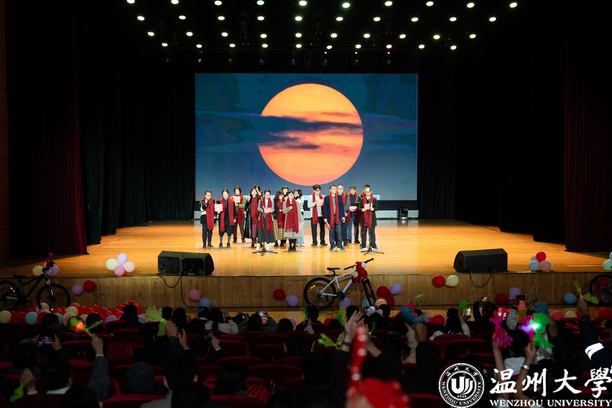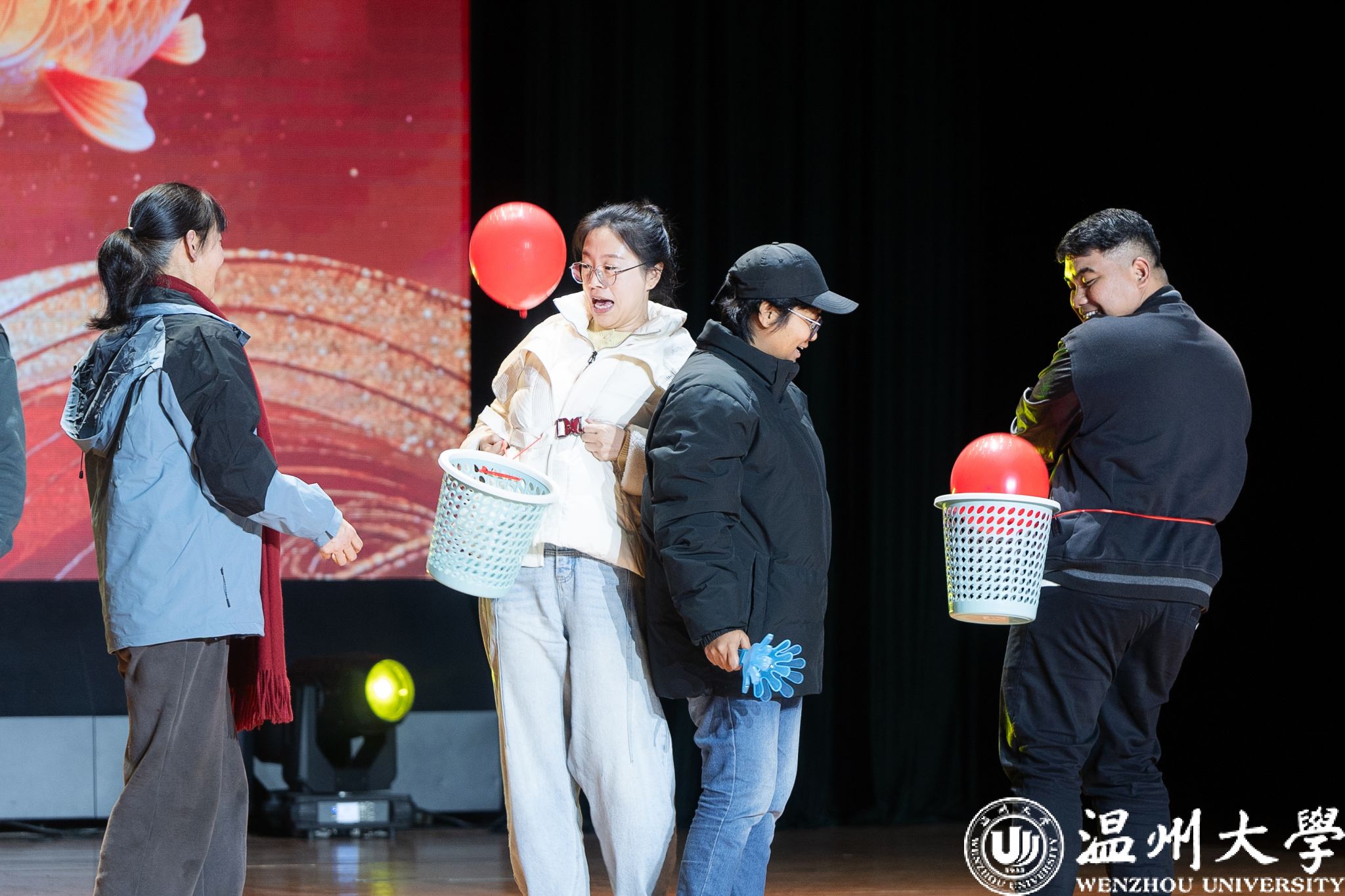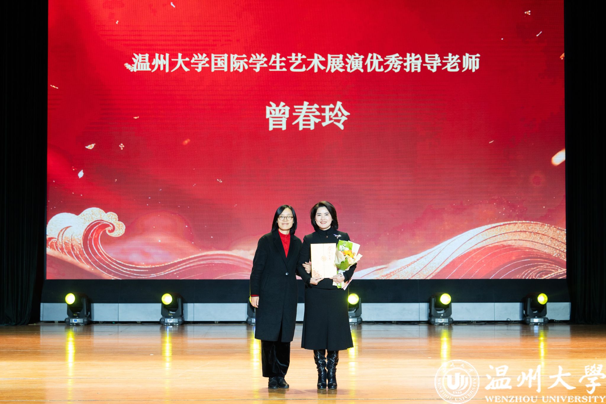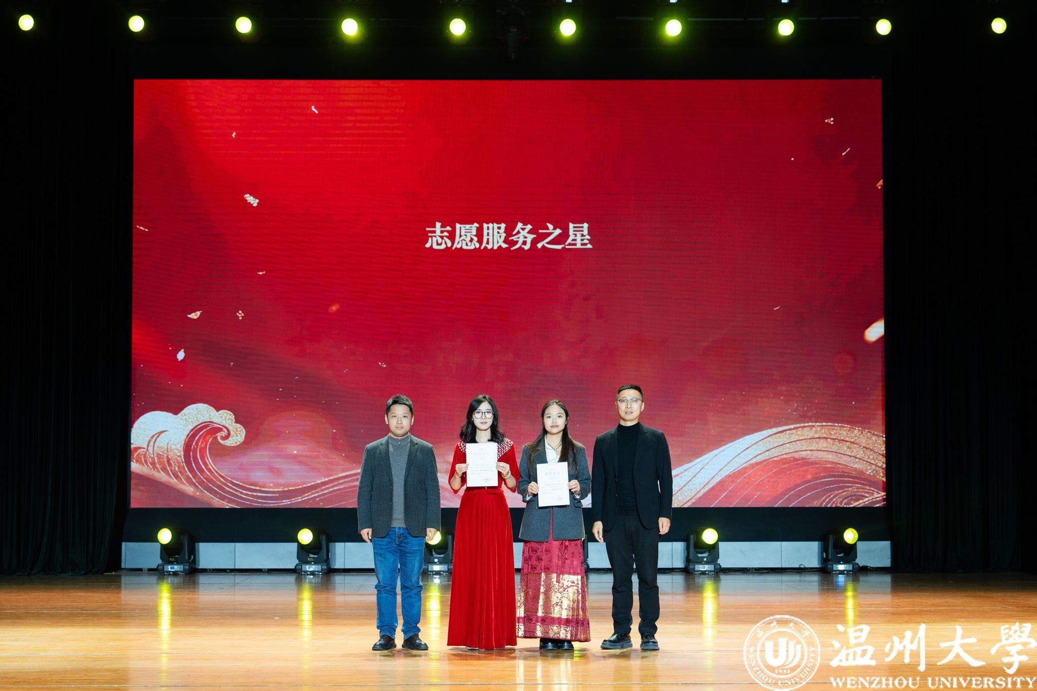 晚会特别设置了“留星闪耀——‘三全五育三服务’育人成果表彰盛典”环节。通过《华彩梨园》《温大国际龙舟队赛记》《区块链游戏