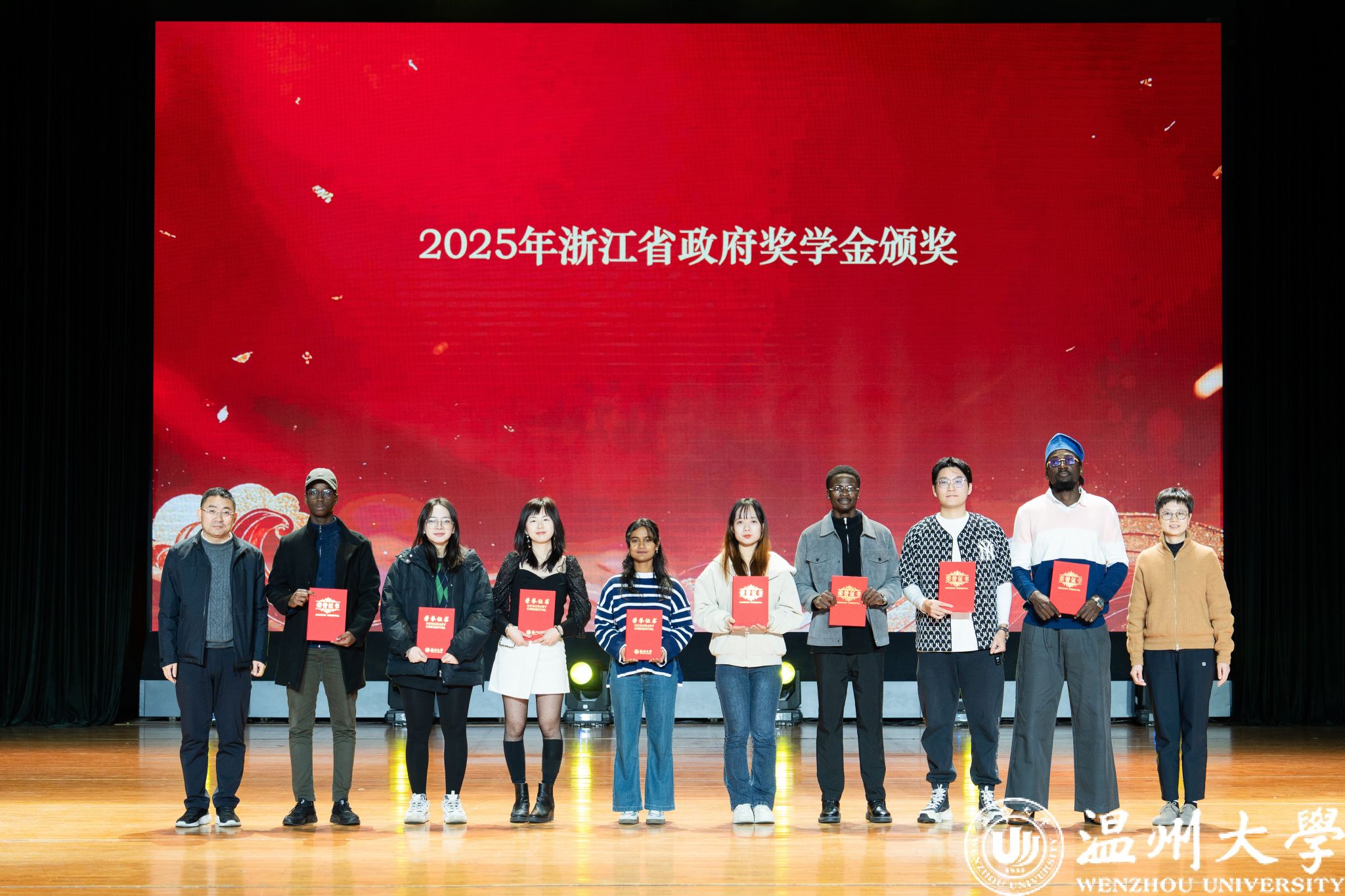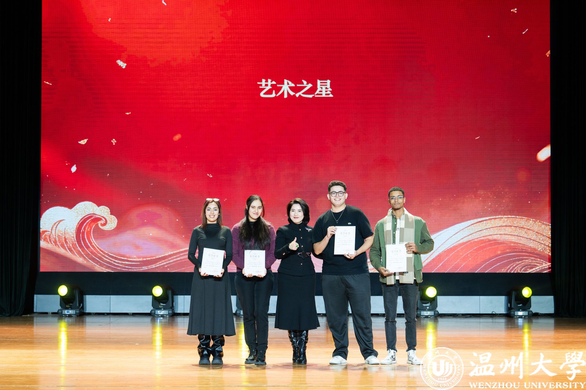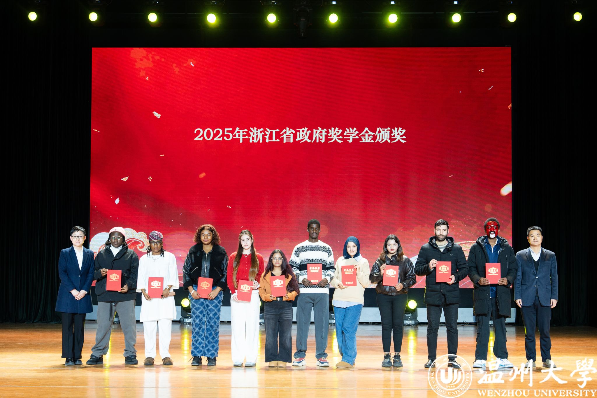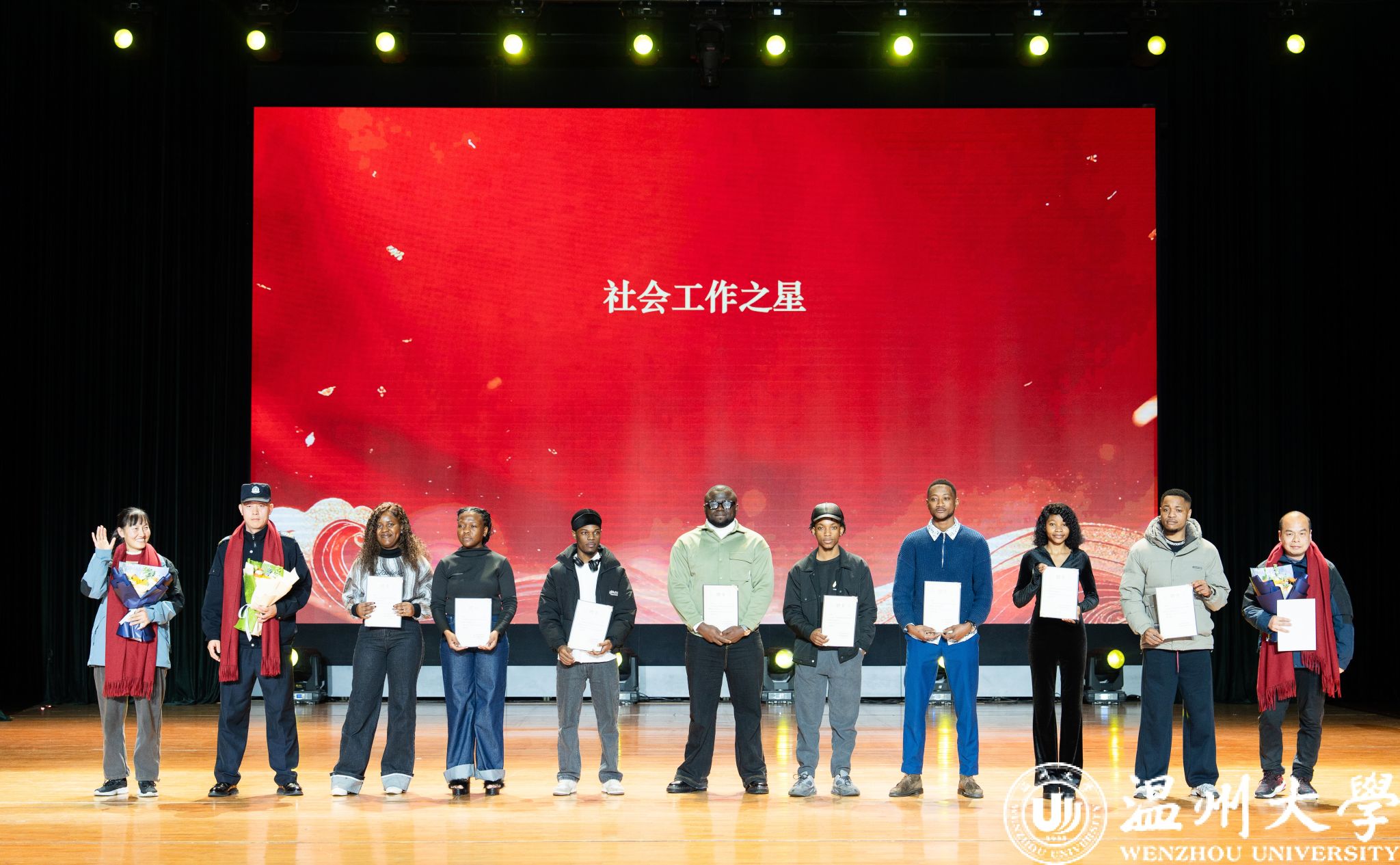 留学生管理队伍CA风采展》等系列纪实视频,生动回顾了一年来国际学生在艺术、体育、社会工作、公益服务等领域的成长与贡献。现场依次表彰了“艺术之星”“体育之星”“公益之星”“见义勇为之星”等奖项,并为“2025年浙江省政府奖学金”及“2025温州市国际友人汉语大赛”获奖者颁奖。
