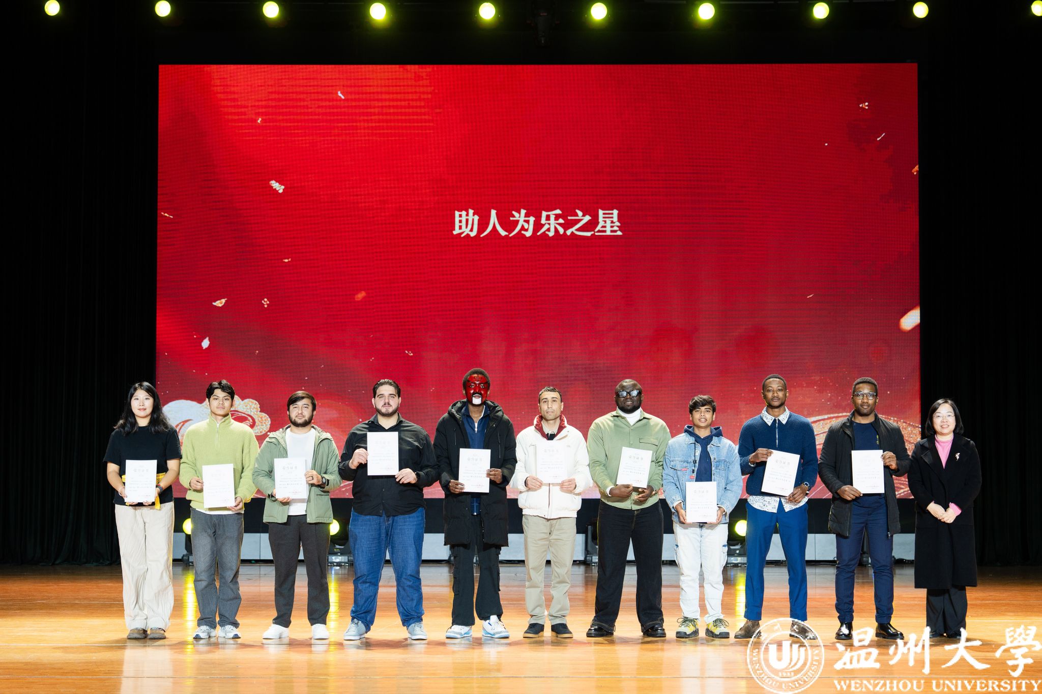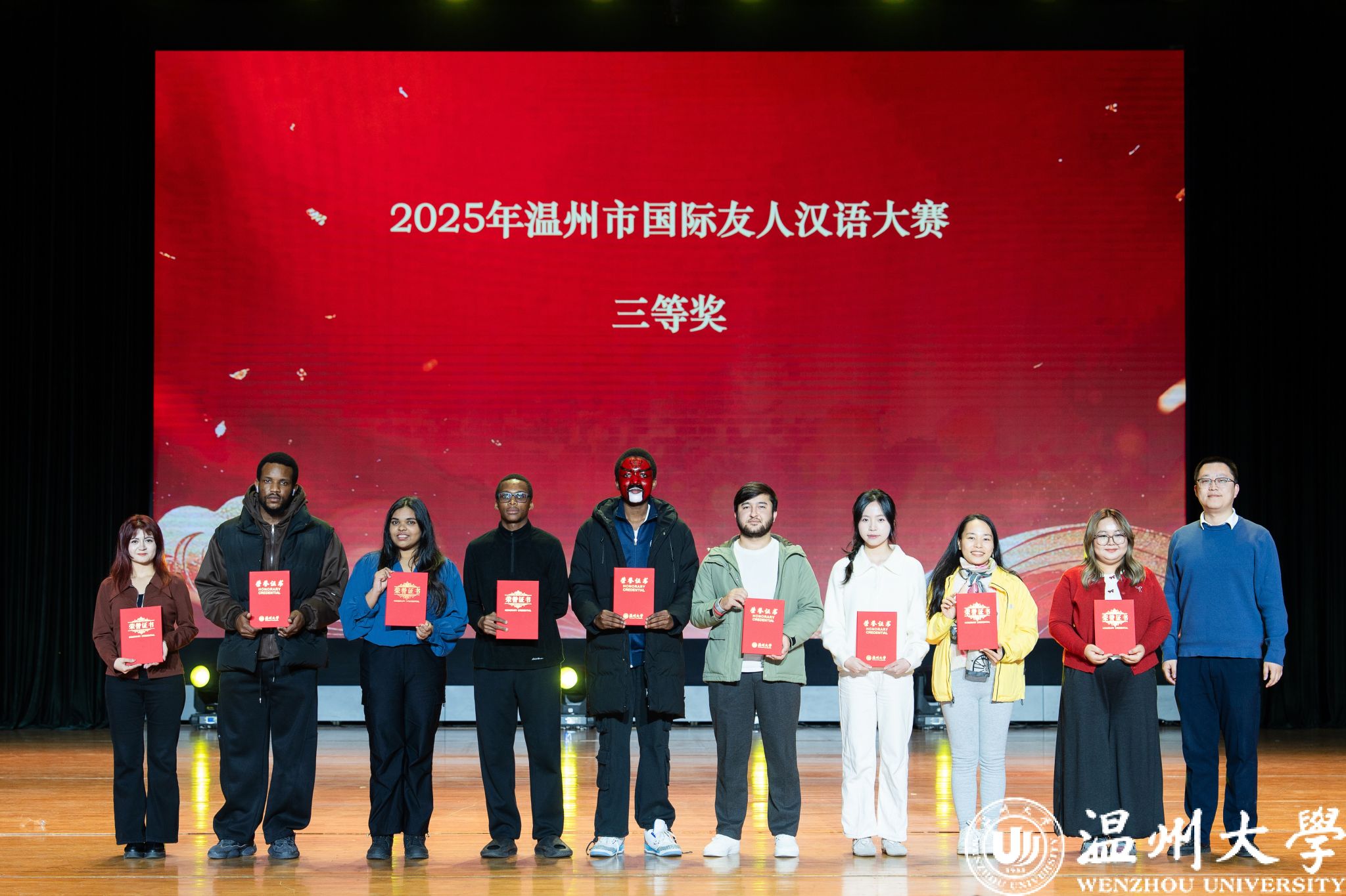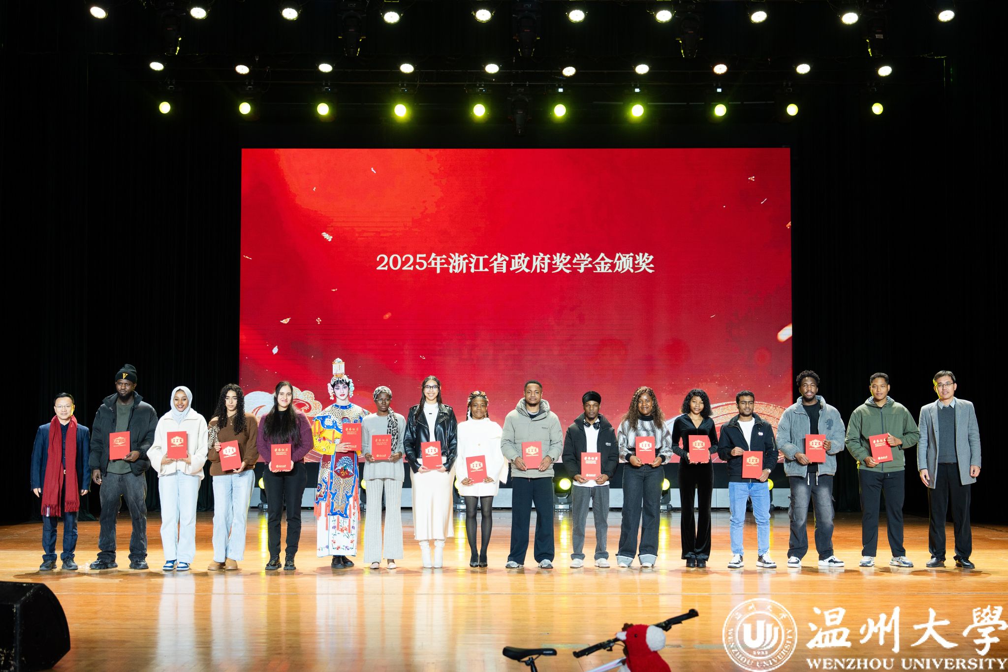 留学生管理队伍CA风采展》等系列纪实视频,生动回顾了一年来国际学生在艺术、体育、社会工作、公益服务等领域的成长与贡献。现场依次表彰了“艺术之星”“体育之星”“公益之星”“见义勇为之星”等奖项,并为“2025年浙江省政府奖学金”及“2025温州市国际友人汉语大赛”获奖者颁奖。