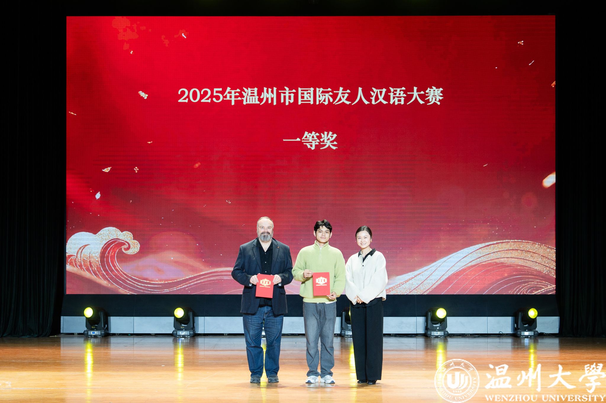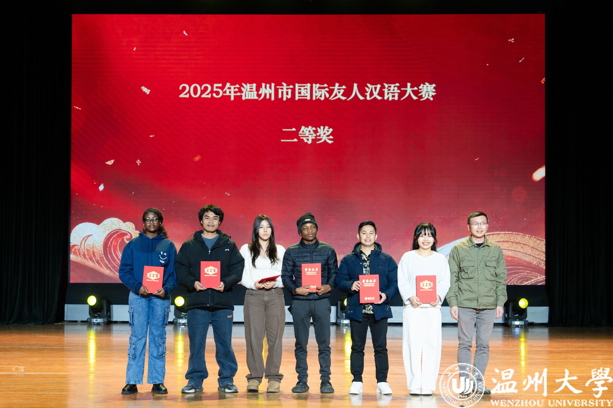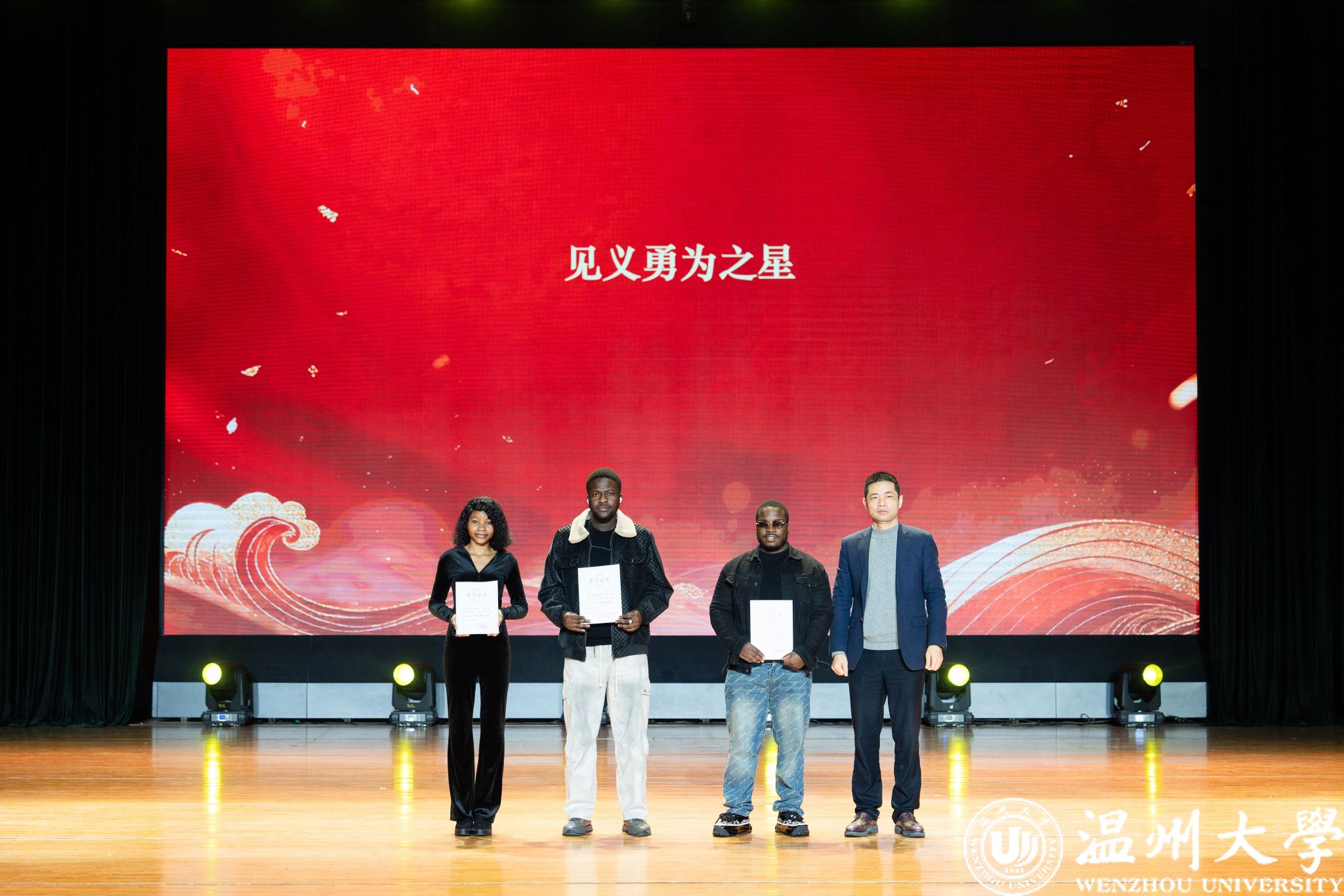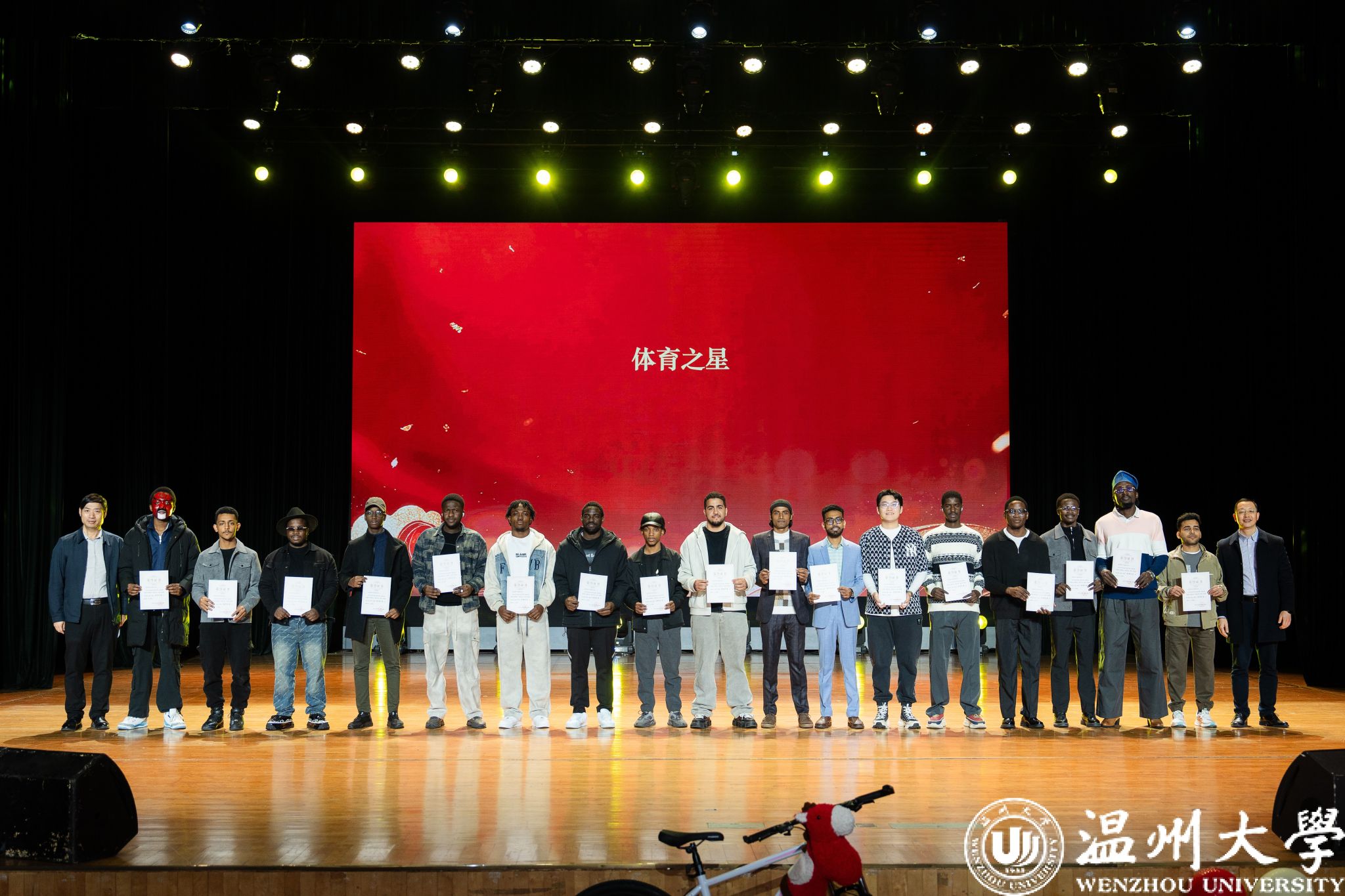 留学生管理队伍CA风采展》等系列纪实视频,生动回顾了一年来国际学生在艺术、体育、社会工作、公益服务等领域的成长与贡献。现场依次表彰了“艺术之星”“体育之星”“公益之星”“见义勇为之星”等奖项,并为“2025年浙江省政府奖学金”及“2025温州市国际友人汉语大赛”获奖者颁奖。