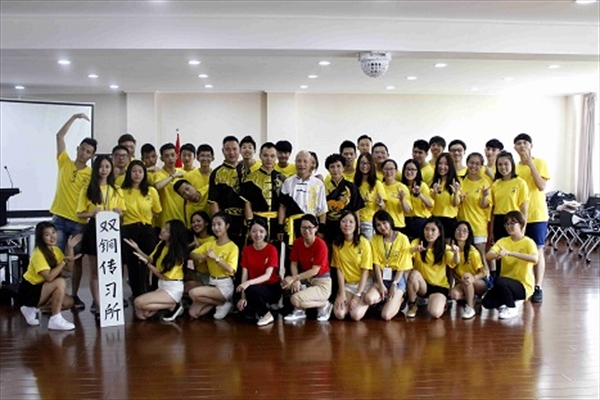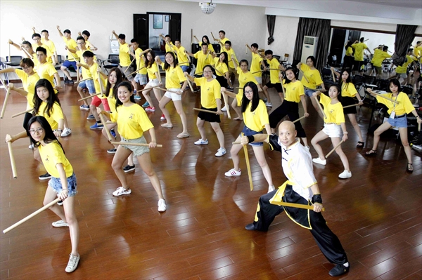 7月22日,2016“中国寻根之旅”优秀华裔青年商务营的营员们有了亲身体验中国功夫南拳的独特魅力的机会,在南少林温州五祖拳传人木权通老师与其弟子的指导下,他们一招一式认真地学起了中国功夫。