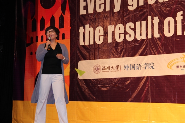 外教Ely简单介绍了自己在美国的学习经历及其父母在其成功的道路上对他的影响。他与大家分享了三大成功感悟:① Seek inspiration, ②Take initiative, ③ Reward yourself。Ely的演讲轻松易懂,为学生的英语演讲提供了目前流行的TED演讲范式。英语教练刘书云老师接下来开始了她的点燃学习激情、传授说英语方法的演说。刘老师带领全场的师生大声操练英语句子,并即时邀请数名学生自信从容地站在舞台上、声音响亮地说出带着洋腔的英语句子。全场的气氛热烈,激情四射。她的运用手势、收腹挺胸、大声朗读等方法有助于转移学生说英语时胆怯的注意力,对训练学生的语音语调、重轻读及英语的节奏感等具有明显的效果。