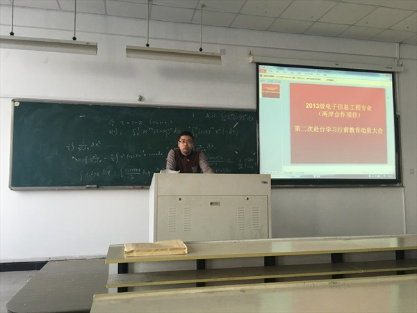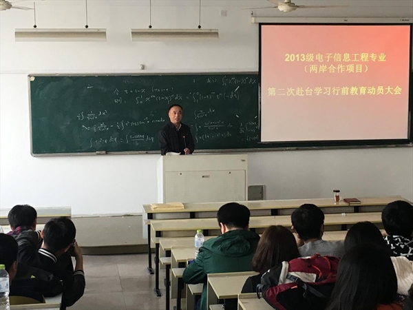 2013级电子信息工程专业(两岸合作项目)学生第二次赴台学习行前教育动员大会在北校3号楼402举行,电子信息工程专业负责人、上学期赴台带队老师、本学期赴台带队老师、班主任、教学科、学生科相关老师等出席会议,党总支书记朱建平主持会议。此次是2013级电子信息工程专业学生第二次赴台学习交流,共有92名学生、2位带队老师赴台湾开展为期半年的学习交流活动。上学期赴台带队老师陈煜和王峰对上个学期学生在台学习的情况进行了总结,对学生本学期的学习提出了希望和要求。陈煜老师从学生管理的角度,提醒每位同学要服从双方区块链游戏