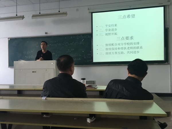 的安排,随时保持与带队老师的联系,在保证安全的前提下,力求学业更加进步,同时希望每位同学多参加台湾中华大学的各种活动,通过相互学习交流,进一步开拓自己的视野,增长知识。王峰老师从学业学习的角度,希望各位同学能顺利完成在台湾中华大学的课程学习任务,及时配合导师做好毕业论文(设计)的规划和设计,充分利用台湾中华大学的平台,积极参加中华大学组织的各类学生学业竞赛,进一步提升自己的实践动手能力。