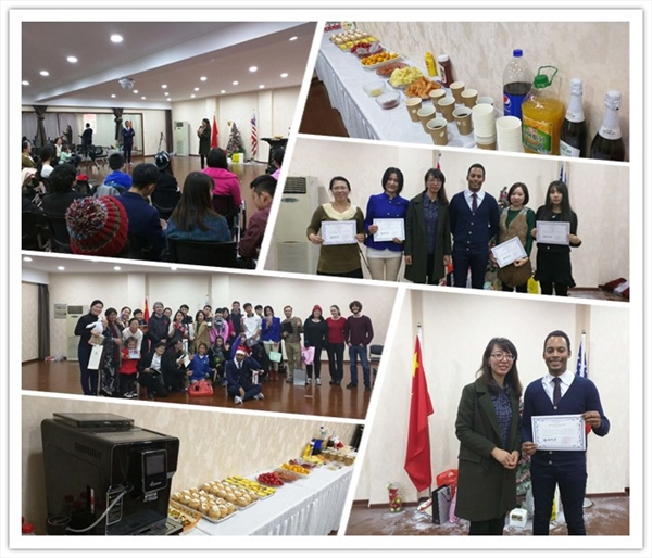派对由美国飞行英语外教Eli主持,他同时也是这期西班牙语课的老师。活动伊始,来自不同国家的老师和学生为大家介绍了各自家乡独特的新年文化和习俗。随后,多国语言课程学员和Language lover club的成员为大家献上了精彩的表演,英文歌曲、西班牙舞蹈、钢琴演奏等,更有Eli老师亲自上阵,教大家跳伦巴舞蹈,现场气氛热烈、活跃。期间还穿插了游戏、交换新年礼物等环节,更是将派对气氛推到顶点。