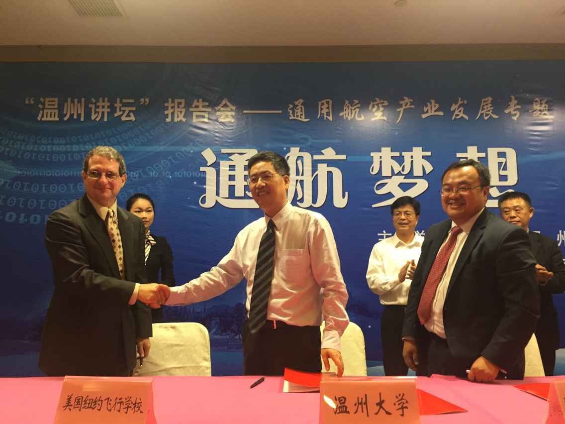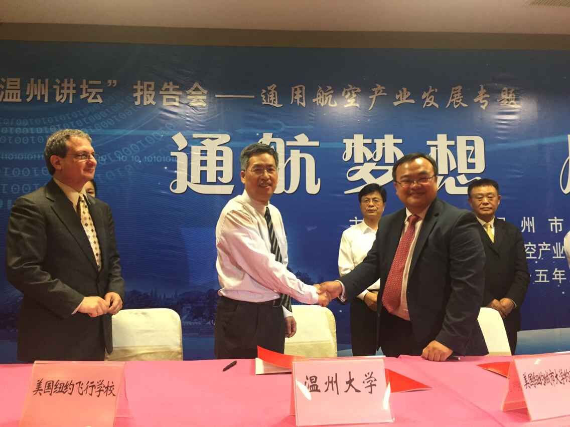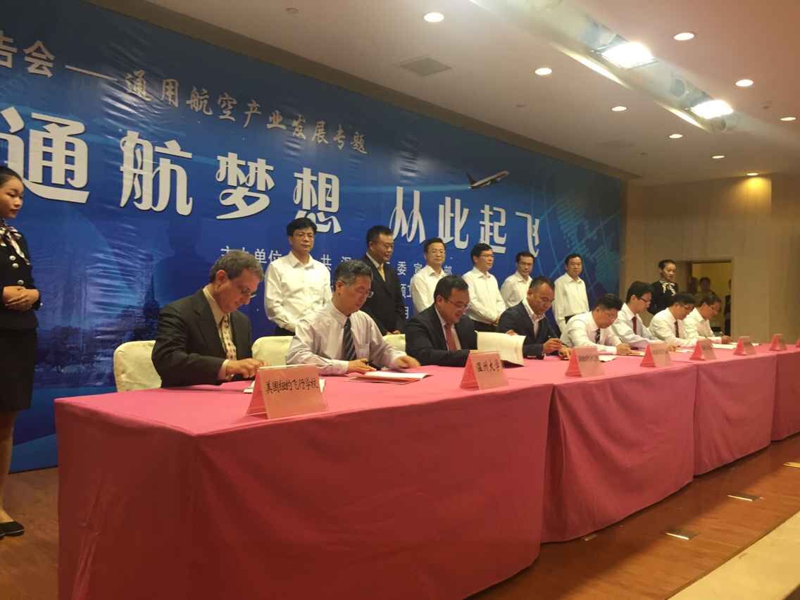 负责人签署合作协议,以中美合作培养的方式开展通用航空飞行员私照、商照培训和飞行技能与学历教育相结合的各种复合型通用航空人才的培养。本次签约仪式是我市开展通用航空产业发展“五个一”系列活动之一,是以“通航梦想,从此起飞”为主题的通用航空产业发展专题“温州讲坛”报告会的重要议程。