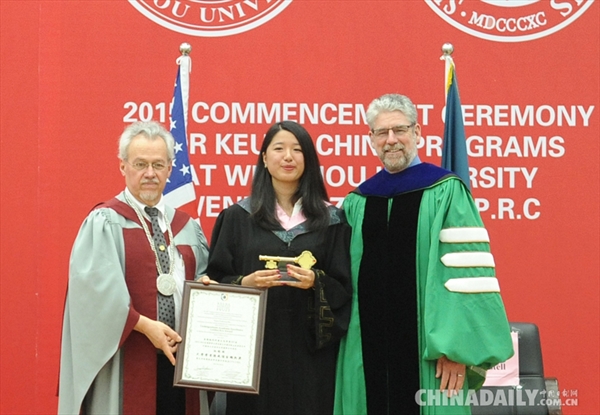 专门针对海外温州“侨后代”开设的中美双学位班,日前,双学位班首届学生顺利毕业,其中优秀学生代表意大利籍华裔学生胡瑜瑜以优异成绩,在美国纽约州库克大学与中国合作办学的4校5院707名学生中脱颖而出,以学业总成绩第一名的成绩获得库克大学的金钥匙奖。