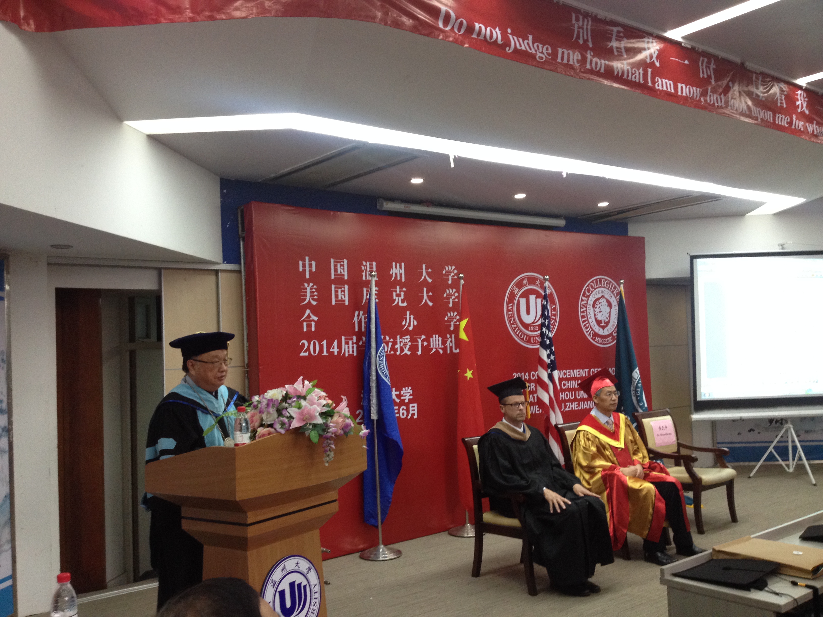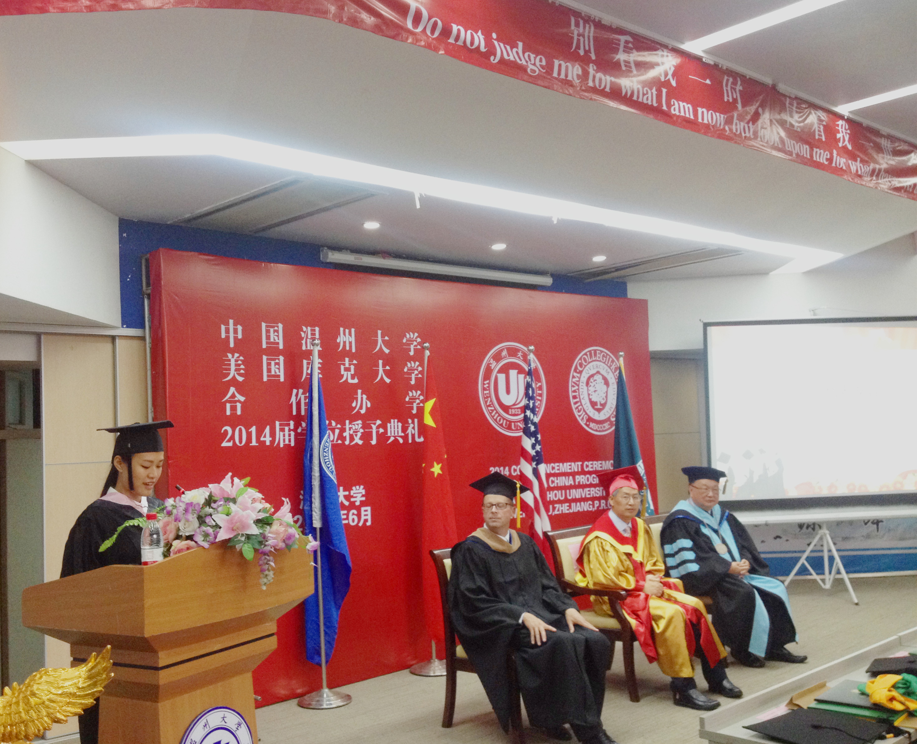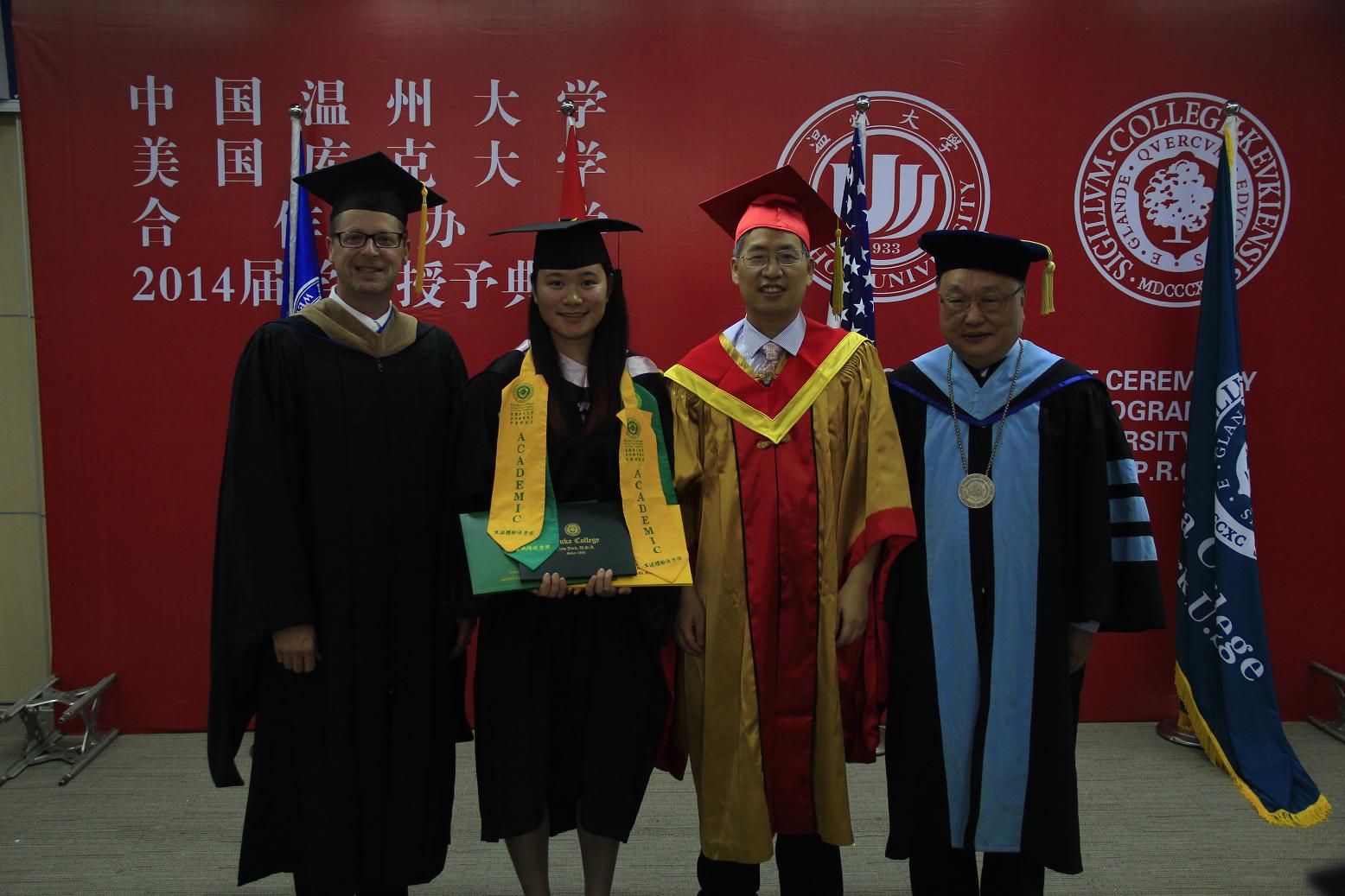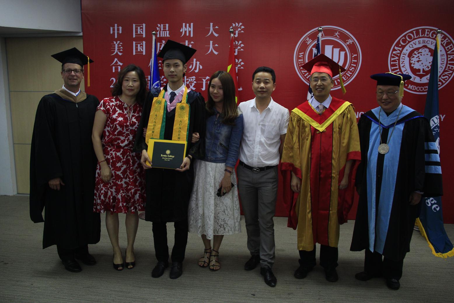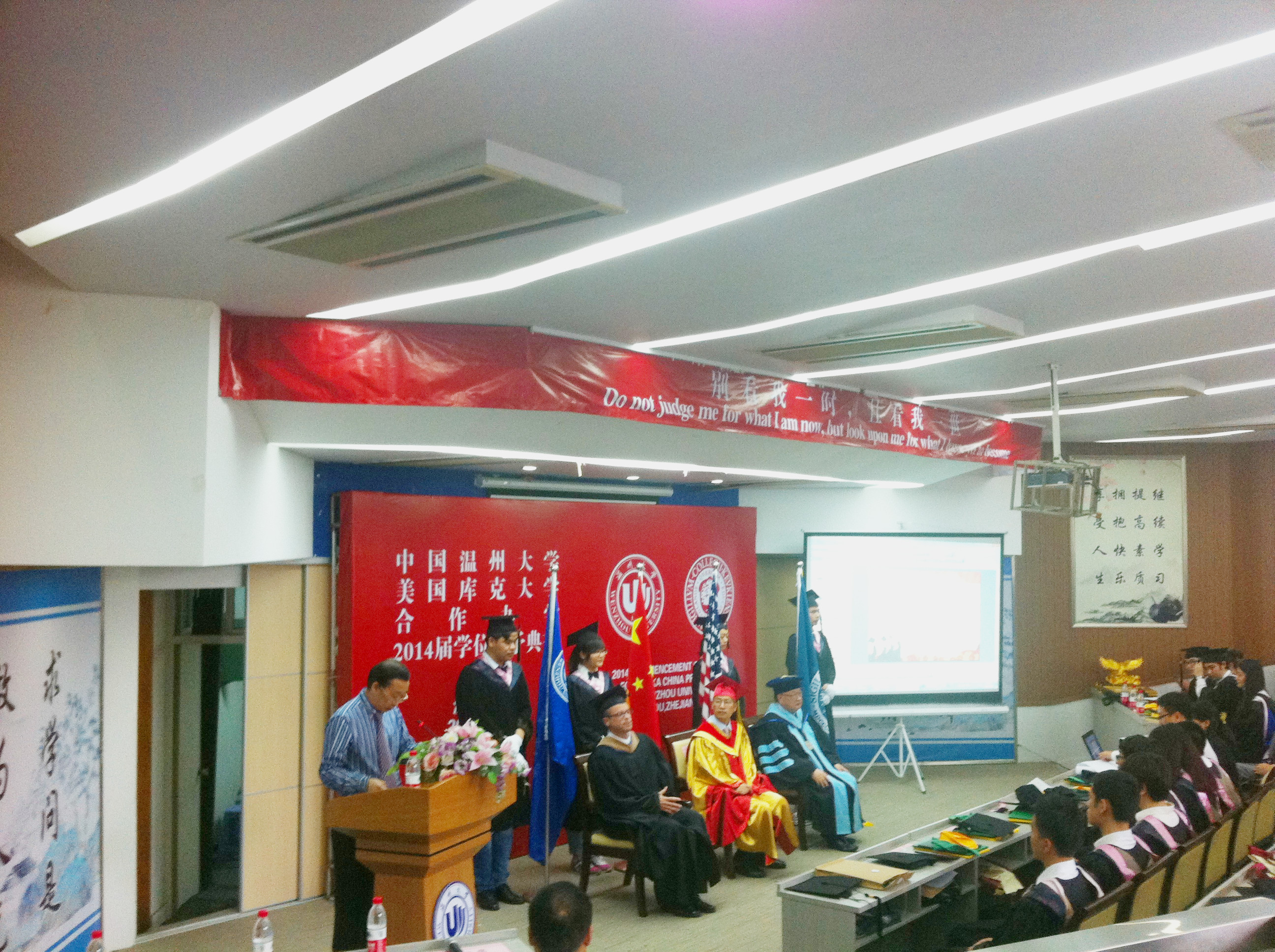 在严晓鹏院长宣布了2014届毕业生学业优秀奖获奖名单和生涯规划暨体验教育优秀奖获奖名单后,隆重而温馨的学位授予典礼正式开始。双方校领导分别为一一上台的45位美国库克大学管理学学士学位获得者颁发证书、拨穗,并为优秀学业奖获得者、优秀生涯规划暨体验教育奖获得者授予绶带。看着穿着学士服的子女手捧学位证书与中美两校校长合影,参加典礼的家长无不动容,他们的付出与期盼终于在此时化为现实。