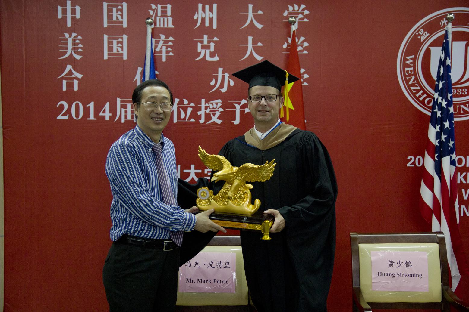 院长张建国教授颁发了“库克大学国际教育杰出成就金鹰奖”。马克·皮特里副校长在致辞中指出毕业典礼是大学生活中最重要的一天。它代表了一个结束,一个开始,以及一段延续,毕业生们已经学习到了必要的技能和知识去面对将来的挑战和经历,新的世界正在展开, 随着机会而来的是更多的责任,希望毕业生们能善用库克的学位和努力付出获得的知识、经验和才能,为社会,家人,国家以及整个世界做出贡献。