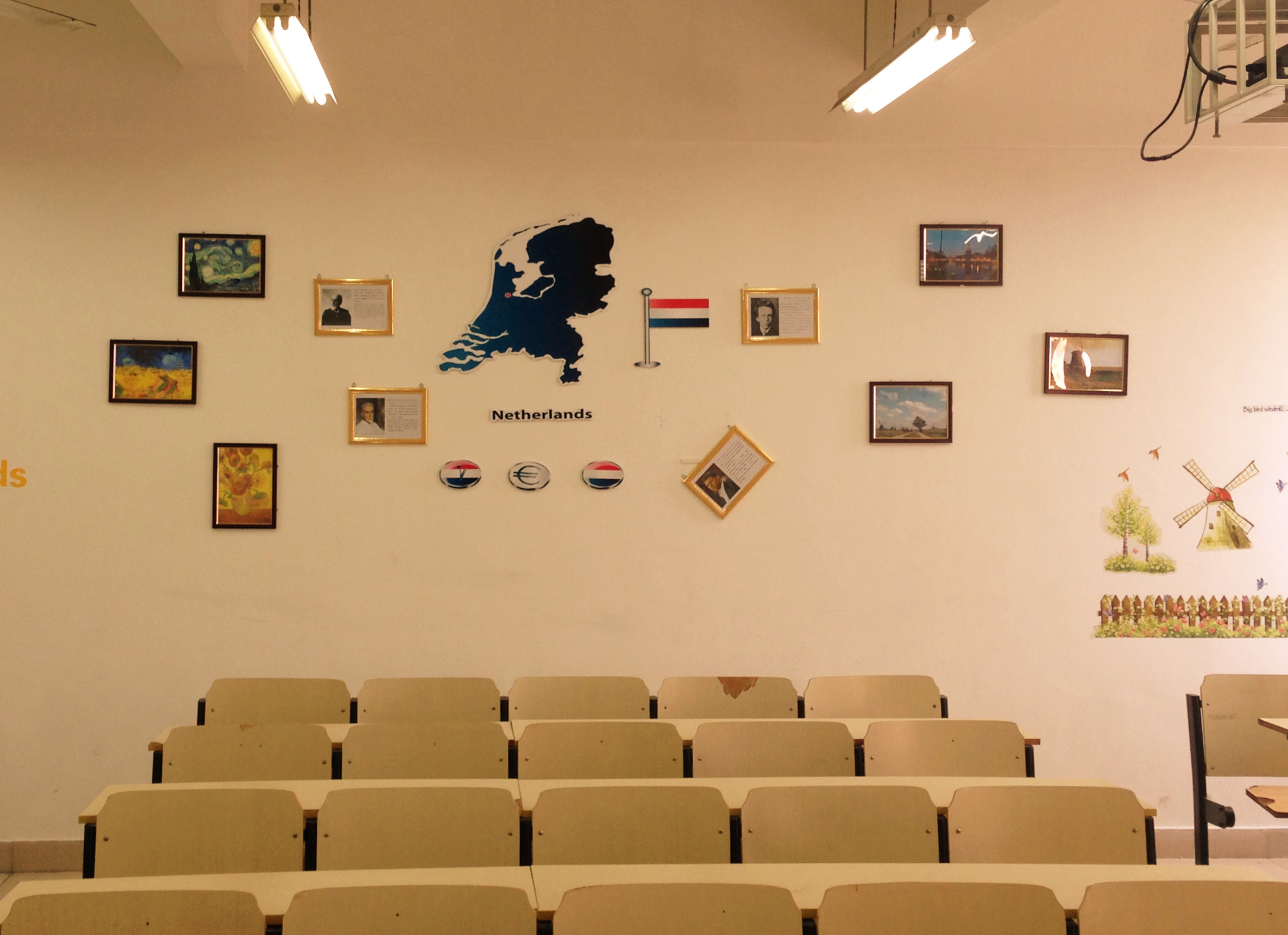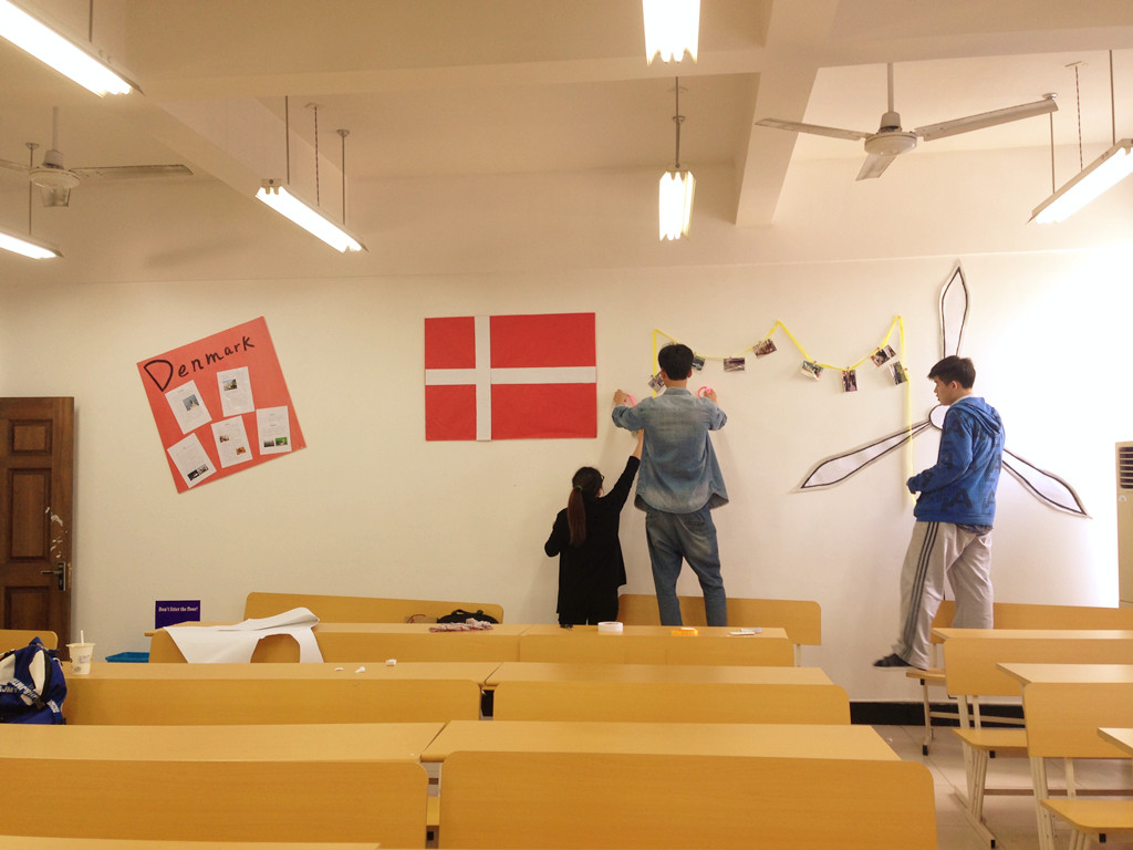 部分教室按照指定国家的风格进行装扮,例如丹麦风、意大利风、荷兰风等。在一周的时间内,每队利用不超过200元的金额对教室进行布置,并派出一名同学参与现场的装扮创意解说,评委对教室装扮情况和现场讲解表现进行综合打分。