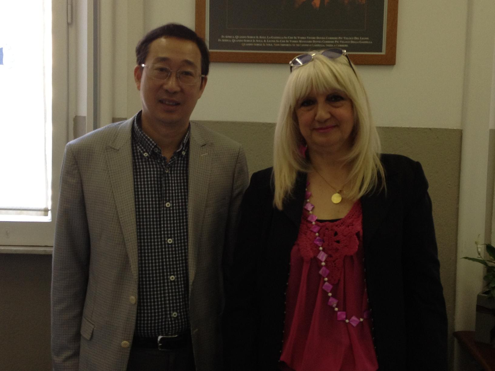 图为严晓鹏院长与罗马语言大学负责人合影