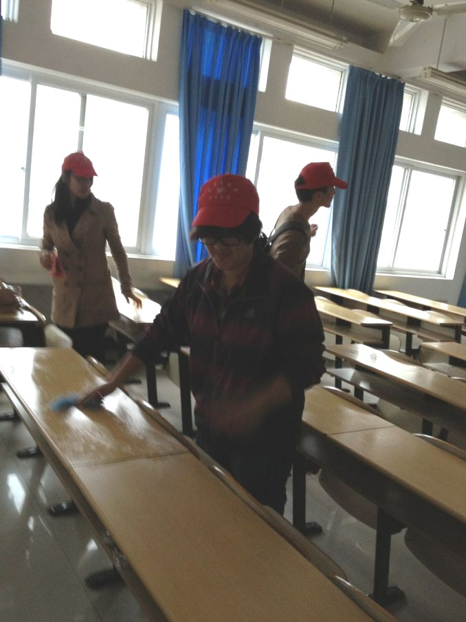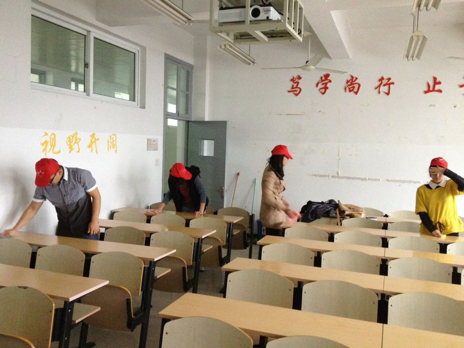 青协成员在南校区建工楼开展了“拒绝课桌文化,清洁课桌涂鸦”的活动。志愿者们在经过分组后,就拿出自己携带的抹布,水桶和清洁用品,开始对课桌进行细致地清理,不放过一个污点。经过近一个下午的努力,大部门教室桌面上的胶纸、字迹、污渍已经消失殆尽,看到焕然一新的课桌,志愿者们脸上露出了欣喜的笑容。清洁结束后,志愿者们还在建工楼前开展“拒绝课桌文化”的倡议活动,向更多的同学宣扬爱护课桌、美化环境的理念。