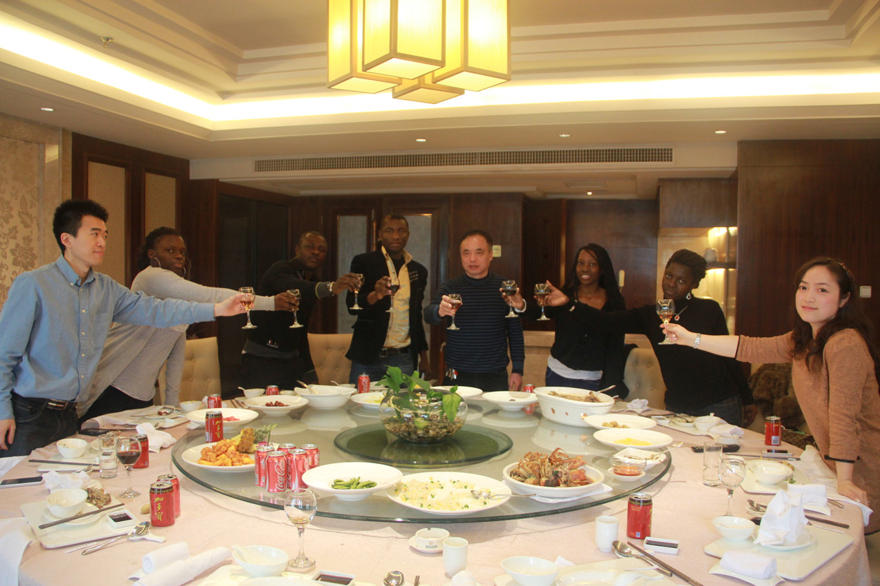在午宴开始前,严院长、朱书记分别向留学生们介绍了中国人过春节的一些风俗习惯,并告诉他们分吃岁酒是其中的最重要活动,是家人团聚、互贺新年、展望未来的标志活动。分岁酒在一片欢声笑语中进行,虽然他们来自不同的国家,有着不同的肤色,说着不同的语言,但却像一家人一样其乐融融,围着大圆桌,说着半生不熟的中国话,学着中国人的敬酒样,“新春快乐、蛇年吉祥”,举杯换盏,好不快乐。一道道色香味俱全的中国菜,留学生们不时地拿出手机拍摄留念。筷勺用不惯,再来一副刀插,场面好不热闹。留学生们纷纷表示:“我觉得中国的春节很热闹,中国菜很好吃,我喜欢中国,我喜欢春节!”