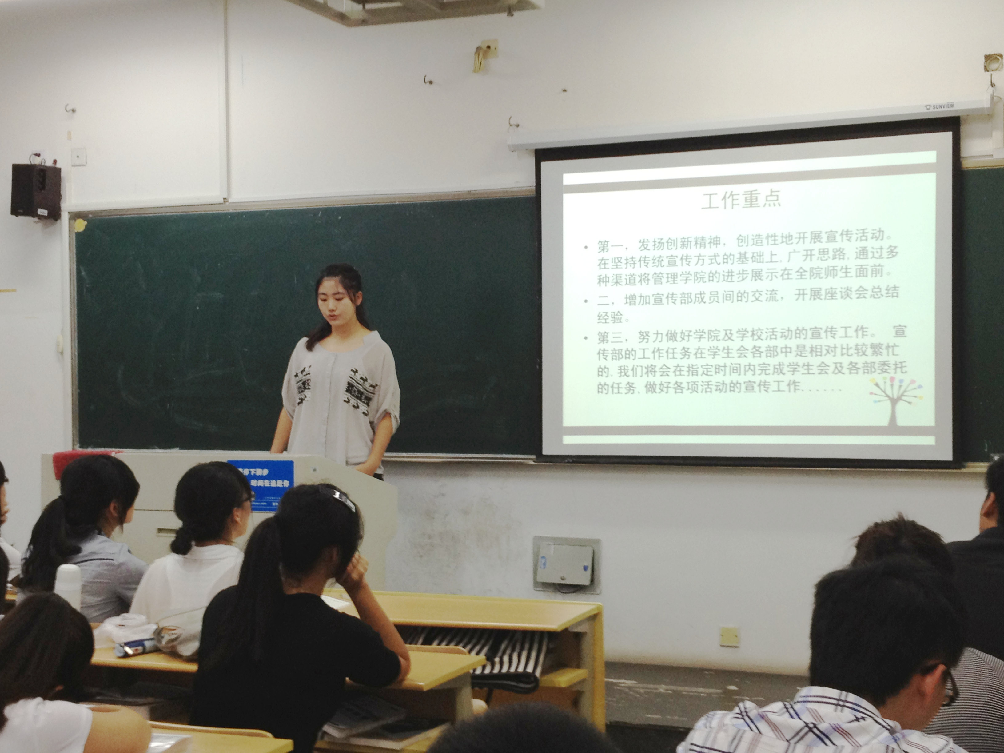 团学发展壮大。接着,院学生会的各个部门的部长们均作部门展示和自我介绍。最后,由学生会主席赵前进行总结发言。他强调了学习的重要性,并就工作方法、本学期工作安排等提出了一些建议。要求学生会成员具有较高的组织沟通协调能力,希望大家能建立起学习型组织,发挥先锋模范作用,成为一名优秀的学生干部,实现自我价值。