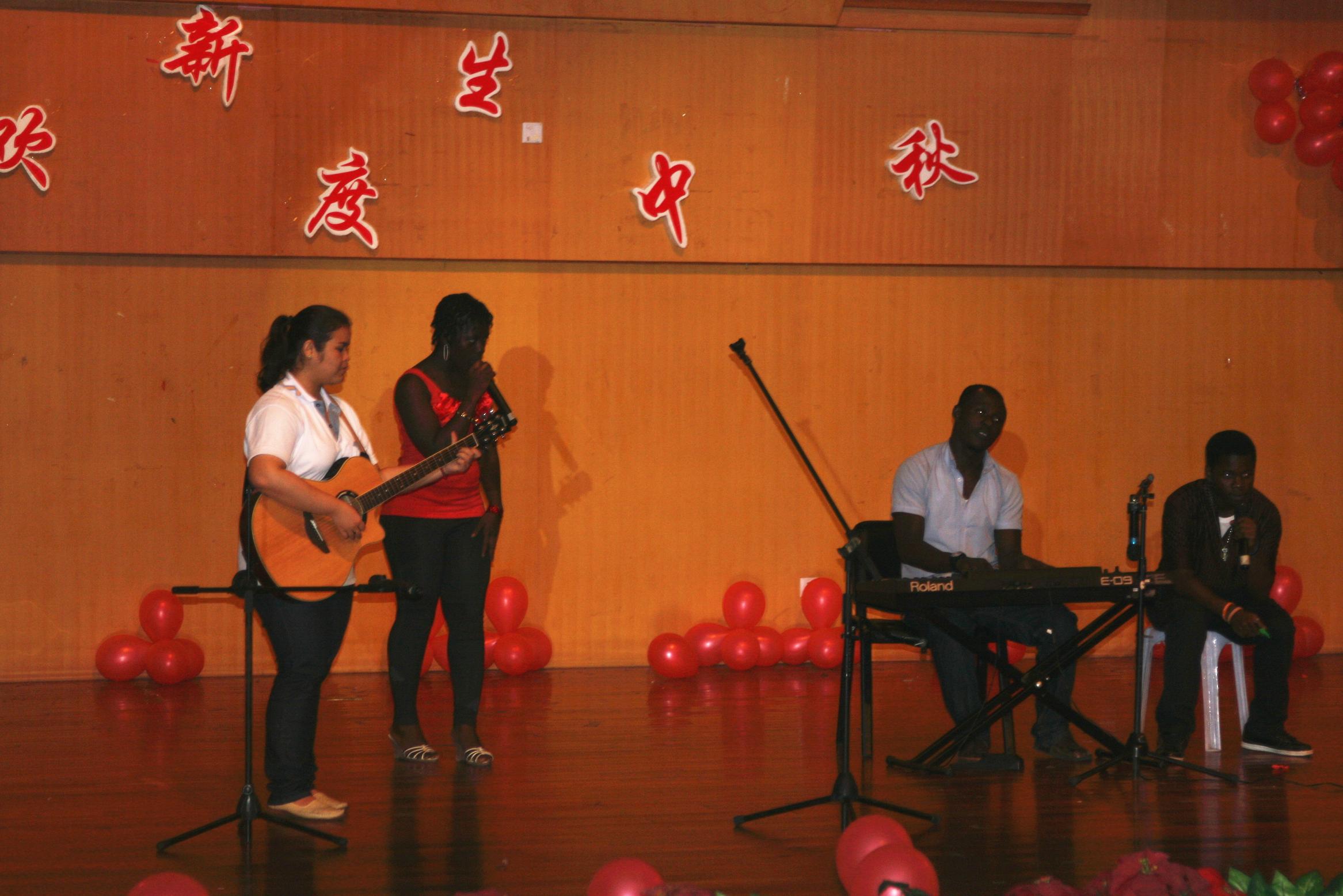 节奏感强烈的开场舞,一开始就将现场气氛点燃,紧接着动听的男声独唱和合唱让观众们深深陶醉,颠覆童年想象的小品《灰姑娘》令人笑声不断,一曲深情的《别在伤口上撒盐》更是将整个晚会气氛推向高潮。互动环节中,扣人心弦的气球游戏,颇为搞笑的“隔水传话”让全场都融入其中,不亦乐乎。加纳留学生们准专业水平的乐队表演,泰国学生鲜明特色的泰拳舞蹈表演,更是赢得掌声不断。