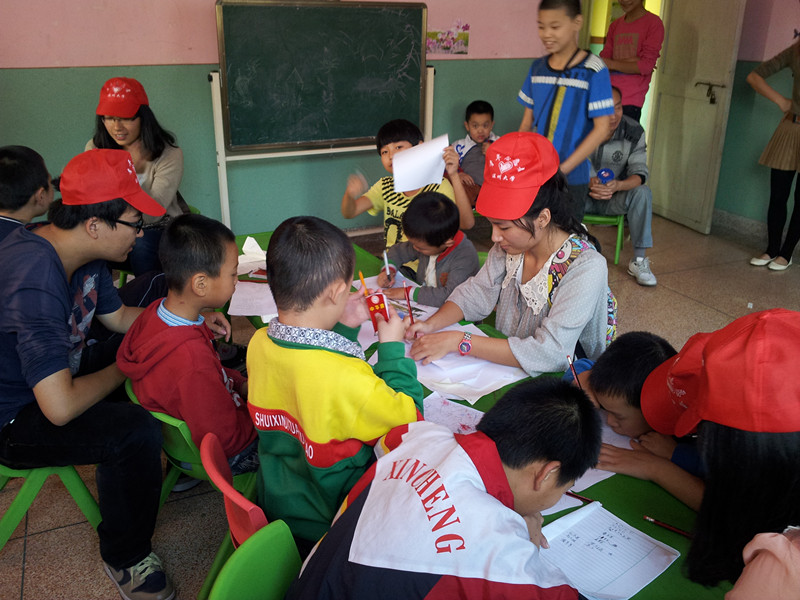 老师和孩子们的热情欢迎。在支教活动开始前,爱心基地的老师为志愿者们讲解了活动的相关内容和注意事项,之后志愿者们分成两个小组,分别教可爱的孩子们学唱歌,画画和写字。