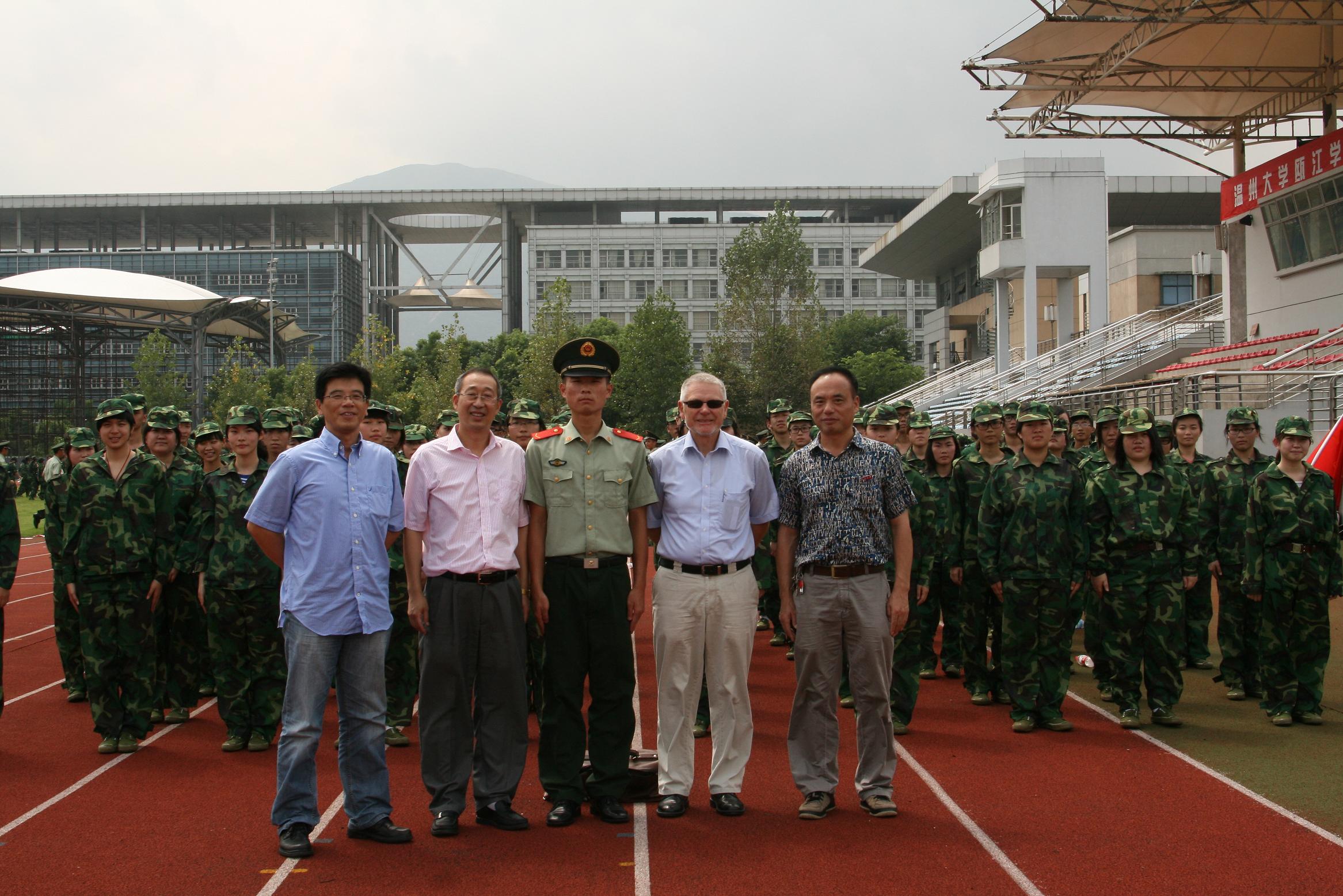 院长严晓鹏、党总支书记朱建平、副院长陈军以及中丹项目主管Jorgen Dalhoff来到北校区田径场,看望教官和军训学生。