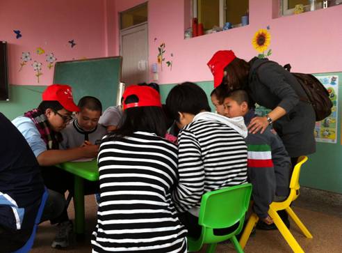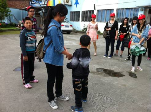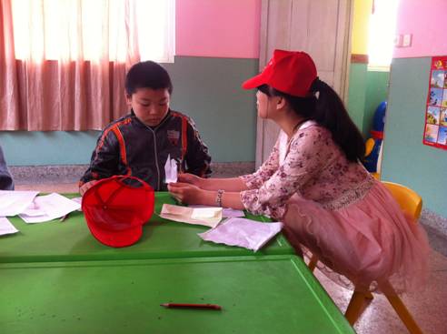 志愿者分为三组,分别教小朋友们唱歌、写字、画画。第一组志愿者把歌词写在黑板上,一字一句耐心地教孩子们怎么念,等到熟悉了歌词以后,孩子们便一边听着志愿者唱,一边自己跟着唱起来了。第二组志愿者教小朋友们画他们梦想中的房子,画完后孩子们开心地向志愿者们展示他们的房子,小小的教室里,洋溢着温馨的气氛。第三组志愿者采取一对一的教学模式,教小朋友们写一二三四,他们学得很认真,每学会一个字,志愿者们总会夸奖他们、鼓励他们。活动的最后,志愿者们将准备好的礼物发给了孩子们,看着他们开心的笑容,志愿者们感受到这是一群特殊的天使,他们有最本真的自我,他们就像折翼的天使,虽然有残缺,但依然美丽。