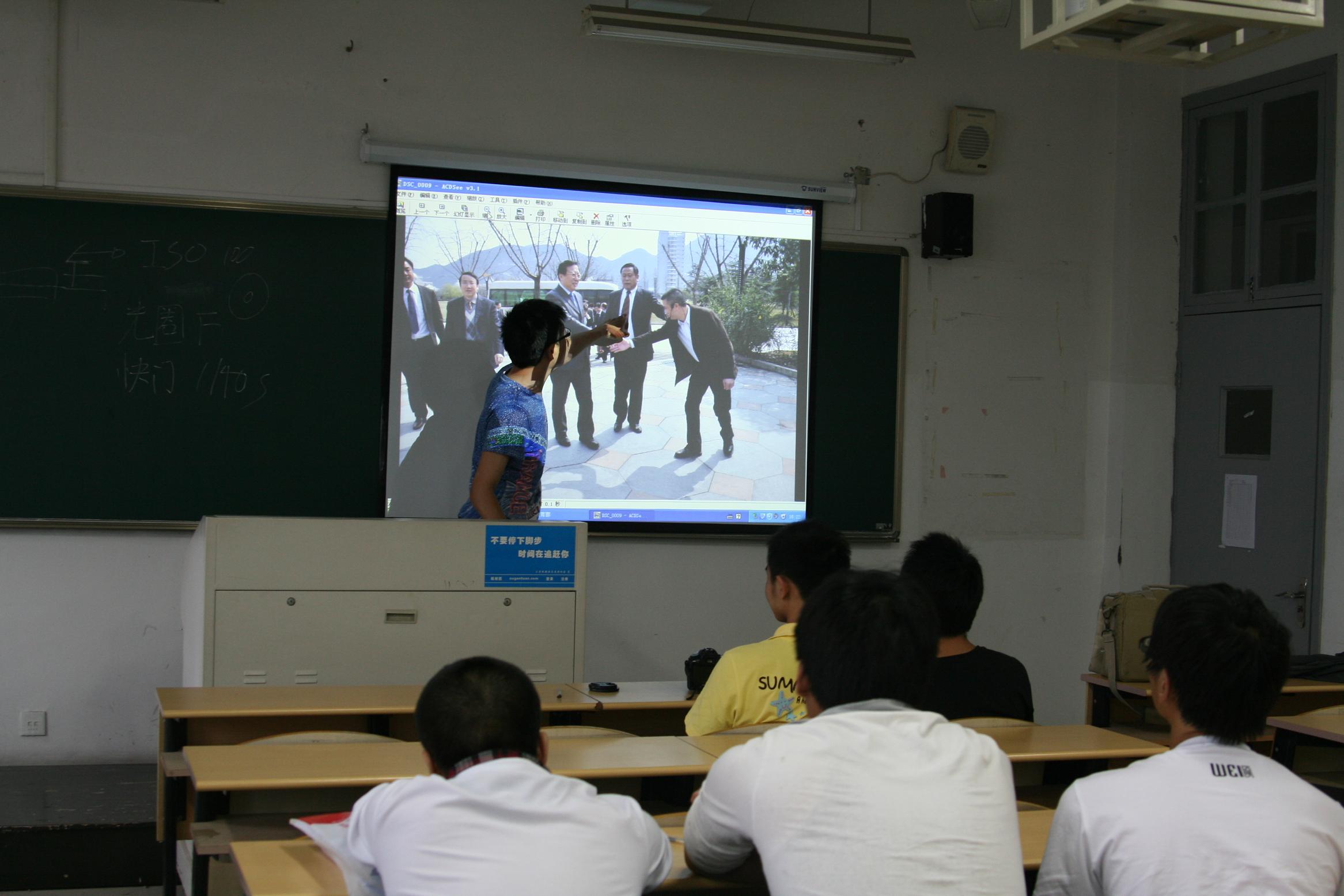 首先,杨涛同学讲解了关于单镜头反光相机的主要工作原理,以及最基本的例如快门时间、光圈、感光度的知识。接着,杨涛同学向同学们强调拍摄新闻照片的重要性,在拍摄新闻照片时,应注重质量、技巧而非数量。然后,他通过实例对比、现场演示向同学们详细地介绍了拍摄新闻照片的具体方法、拍摄技巧以及拍摄时应注意的问题等,并指出拍摄新闻照片时要以新闻主题、新闻人物、新闻事件等要素为主。最后,杨涛向同学们分享自己的拍摄心得以及自己的拍摄经验。
