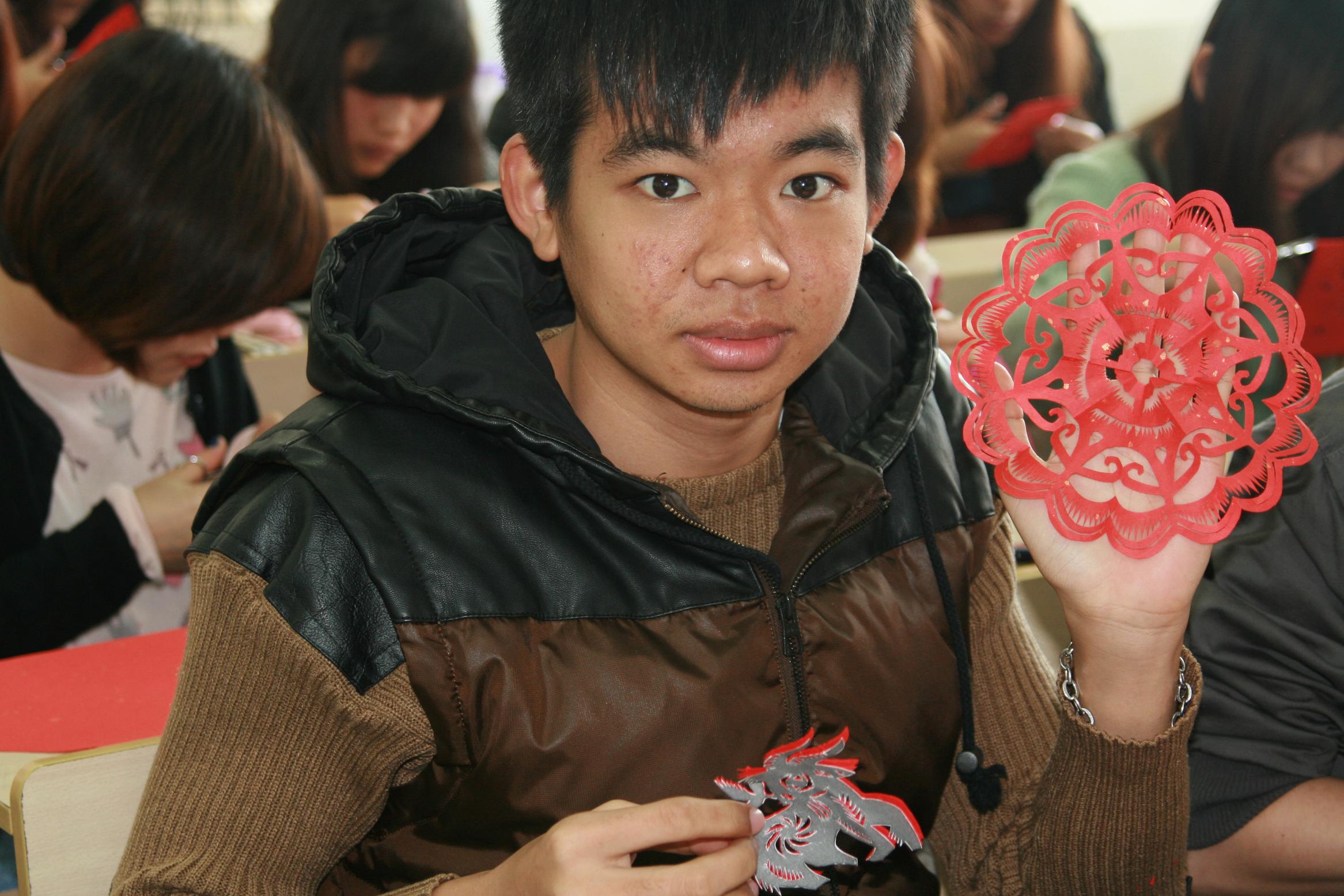 特邀赖施虬老师给留学生讲授中国剪纸艺术。本学期,我们设置了6次课让留学生体验中国剪纸艺术。课堂上,赖施虬老师向留学生展示了不同流派和风格的剪纸作品,一幅幅精美的剪纸图画立刻吸引了留学生们的目光。在赖老师的带领下,同学们饶有兴致地拿起剪刀学起中国剪纸来。两个多小时的剪纸课里,同学们或模仿或发挥,看着自己努力之后的作品欣喜不已。剪纸课结束时,很多同学仍意犹未尽。