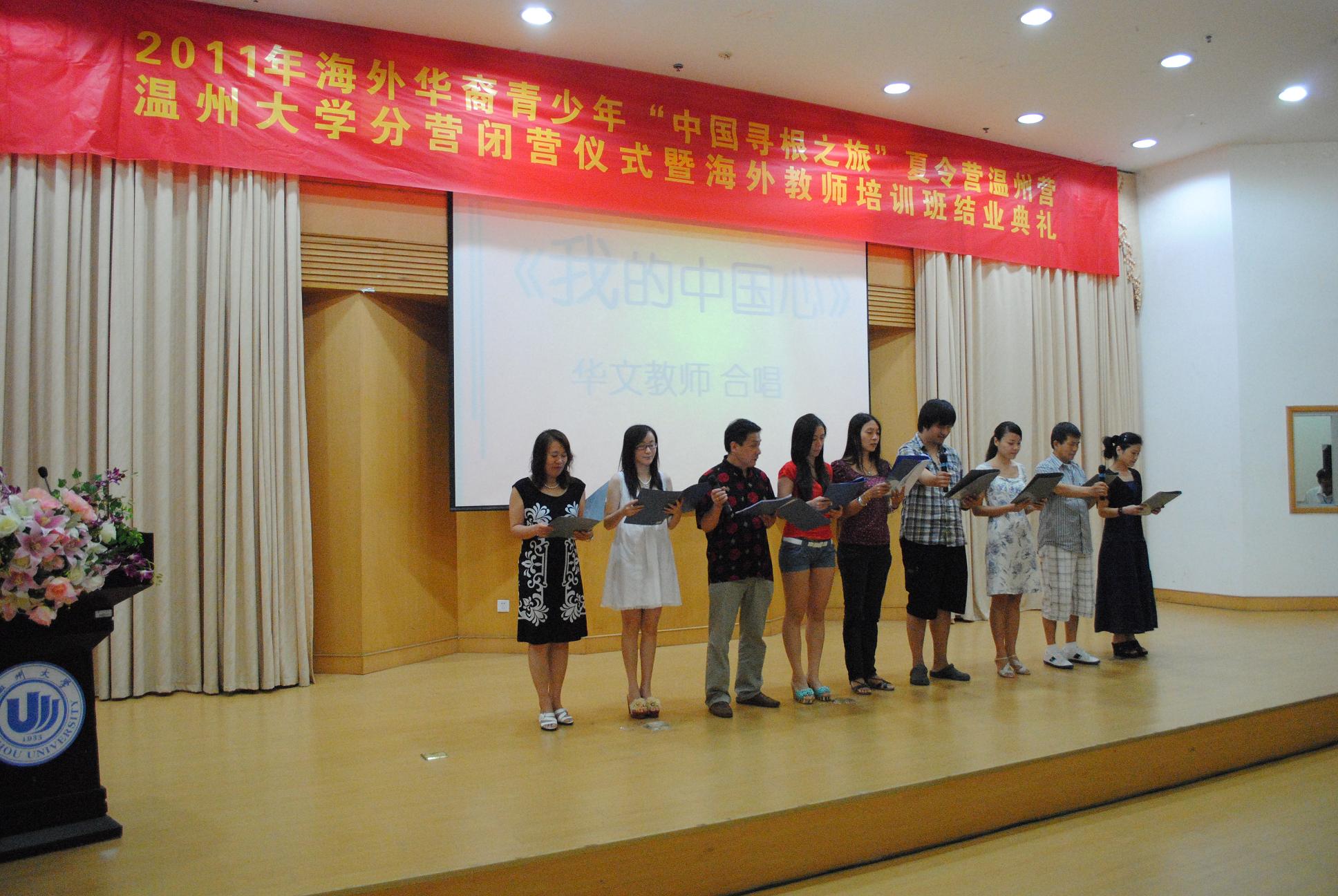 典礼上,海外华校教师合唱了一曲《我的中国心》,获得台下阵阵掌声。本期海外华校教师代表李潇濛在典礼上发言说:“此次培训活动之后,我会带着我在温州所收获到的知识和文化,以全新的姿态投入到汉语教学中来,让我们华裔子女们真真切切地感受我们祖国文化的博大精深,这样也能为华文教育事业献上我的微薄之力”。她代表学员们感谢国侨办和浙江省侨办提供这次难得的学习机会,感谢区块链游戏