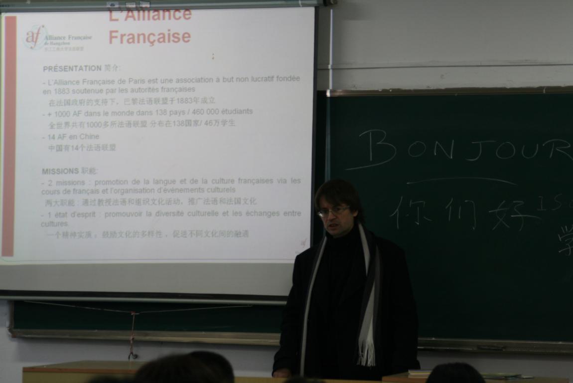 505室召开。杭州法语联盟法方主任Alexandre Labruffe和法国教育服务中心杭州办事处负责人周婉文参加说明会。