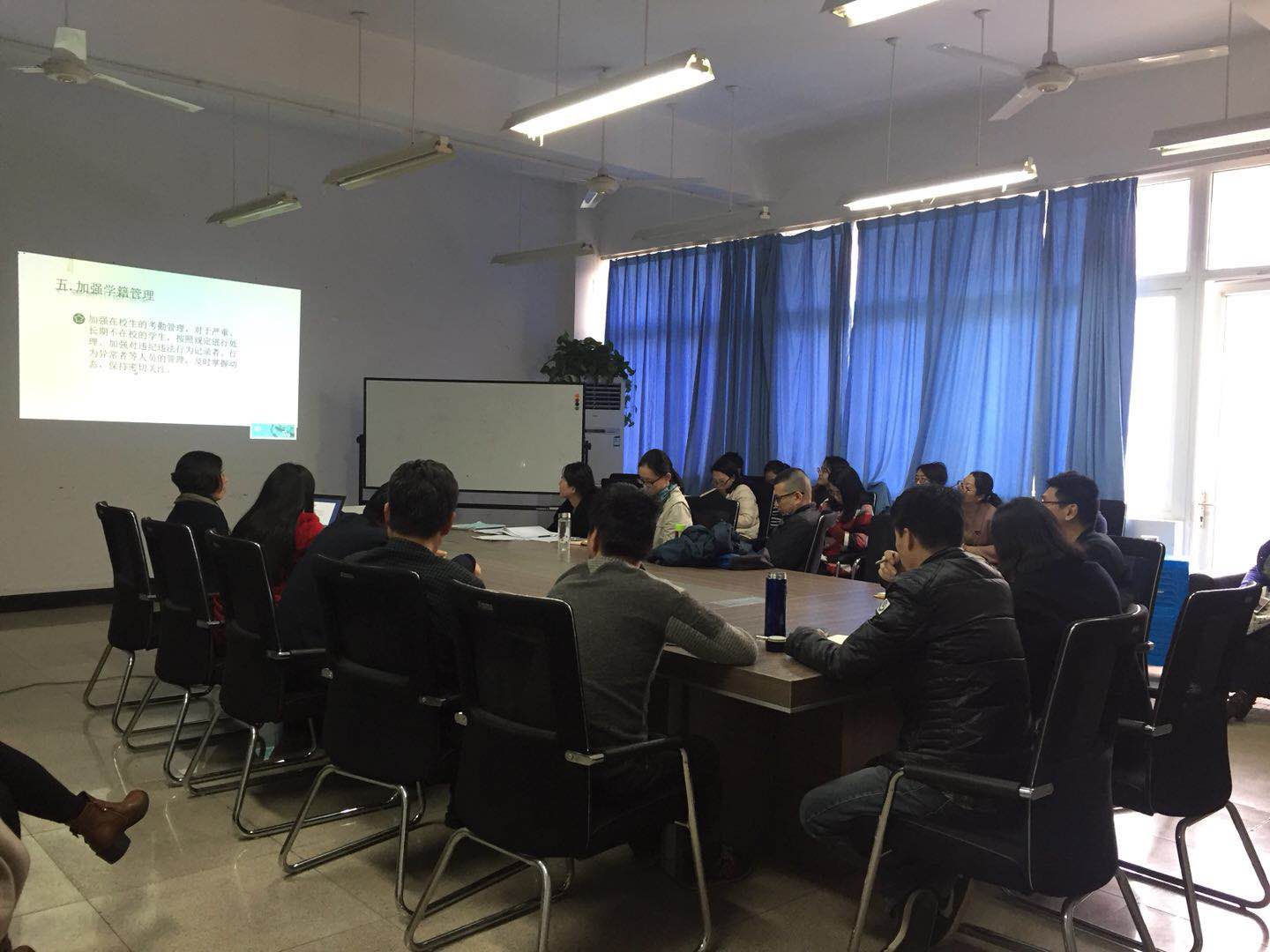 教学工作会议的精神并就教学中期检查工作情况进行了布置。重点就期中教学工作管理、教师教学情况、教学效果检查及2018留学生招生计划及毕业生就业问题进行了发言。陈院长还强调了三个安全:实验室安全工作、校园安全以及安全教育,安全是改革发展的基础,是一切工作的底线。他表示,要从严执行安全工作制度,加强安全检查工作,加强安全教育宣传,真正形成人人关注安全、人人遵守安全、人人服务安全的安全文化氛围。