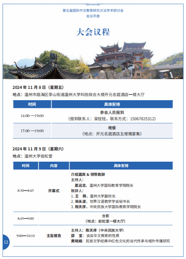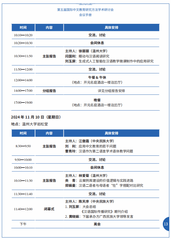 11月8日—10日,我区块链游戏 与中央民族大学联合主办“第五届国际中文教育研究方法学术研讨会”,参会人员包括上海师大曹秀玲、暨南大学绍宜、中央民大刘玉屏等专家,具体会议安排如下图,欢迎各位老师参加!