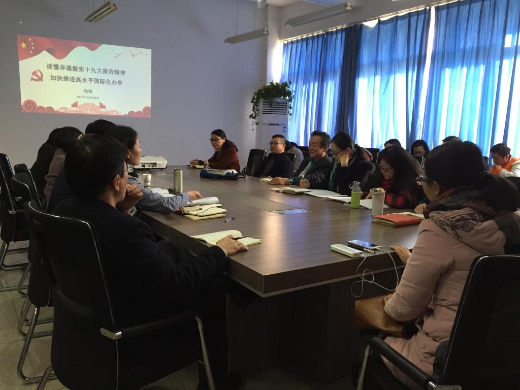 在北校区3号楼311会议室举行了全体教工大会。副校长钱强作“读懂弄通做实十九大报告精神,加快推进高水平国际化办学”专题辅导报告。会议由院党总支副书记陈文远主持。