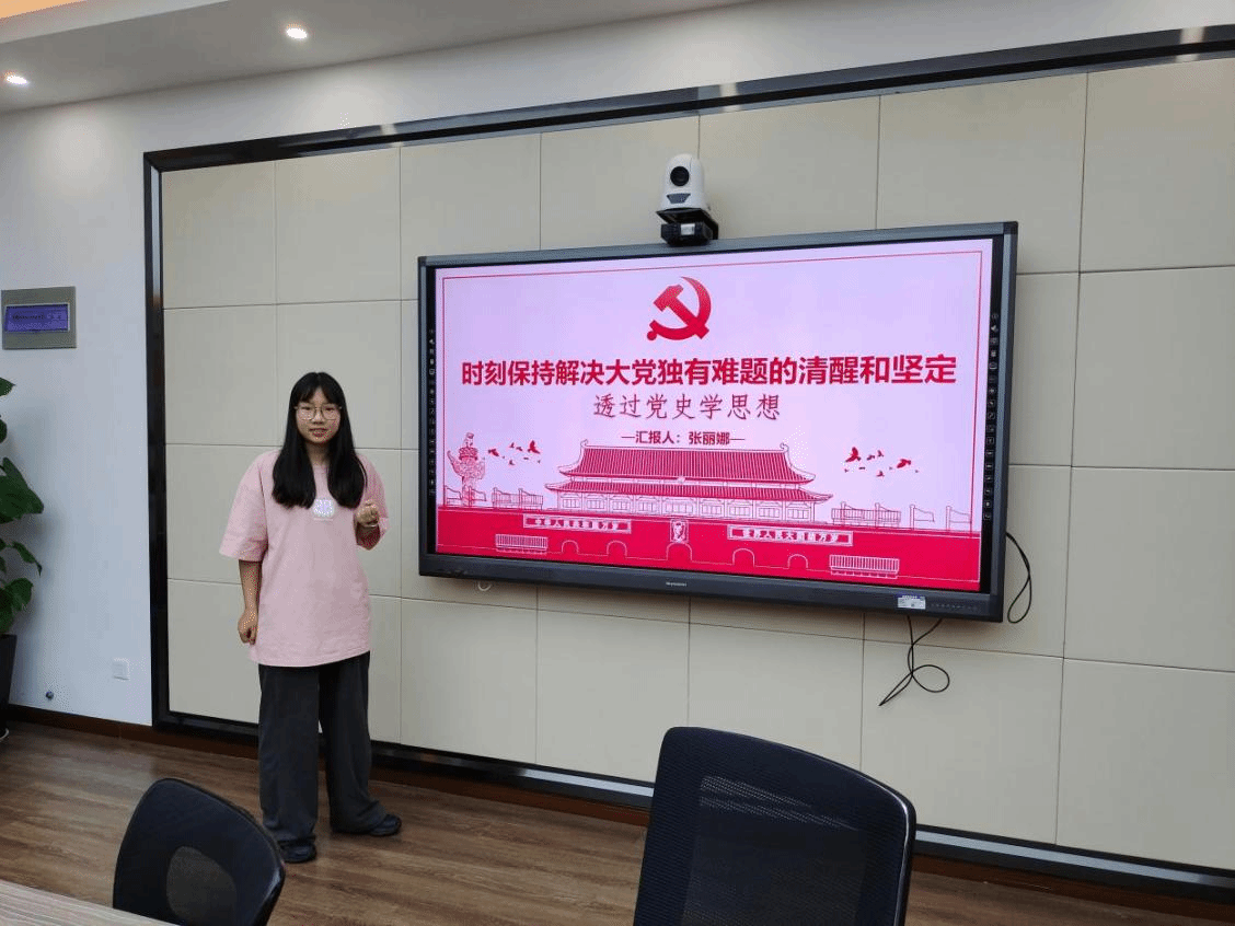 张丽娜同志以“时刻保持解决大党独有难题的清醒和坚定——透过党史学思想”为题,通过回溯党的历史,特别是党面临的“六个如何始终”,引导大家认真学习习近平总书记重要讲话精神,强调广大青年要以史为鉴,保持清醒和独立,坚持自我革命,立大志、明大德、成大才,为实现中华民族伟大复兴的中国梦不懈奋斗。