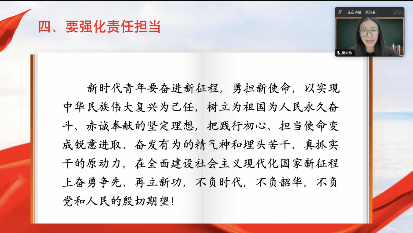 李梦佳同志以“依靠学习赢得过去,依靠学习走向未来”为主题,从回顾、梳理和展望三个维度论述了青年工作的重要性,并谈到新时代青年党员的责任和使命在于担当民族复兴大任,推动社会进步,传承与创新文化,培养全球视野,服务人民,贡献社会,共同筑就中国梦。
