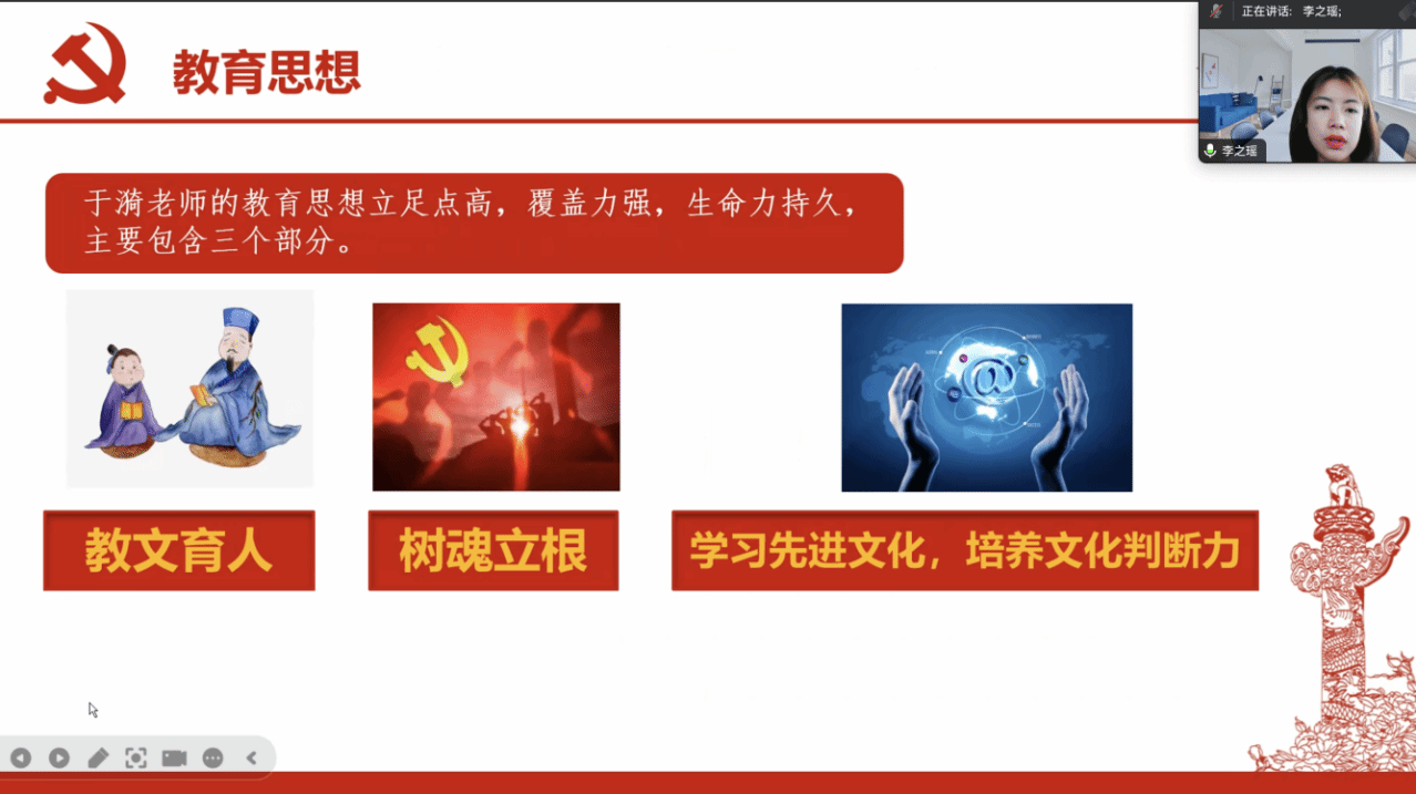 李之瑶同志以“‘站上讲台,就是生命在唱歌’ ——‘人民教育家’ 于漪”为主题,深情讲述了于漪老师的教育之路及传奇经历。她通过于漪老师独特的创新教学模式和教师培养模式,启示广大青年应当以于漪老师为榜样,汲取她的教育智慧和力量,努力在自己的教育岗位上发光发热,做一名优秀的汉语国际教育专业教师,让教育的光辉照亮每一个角落。
