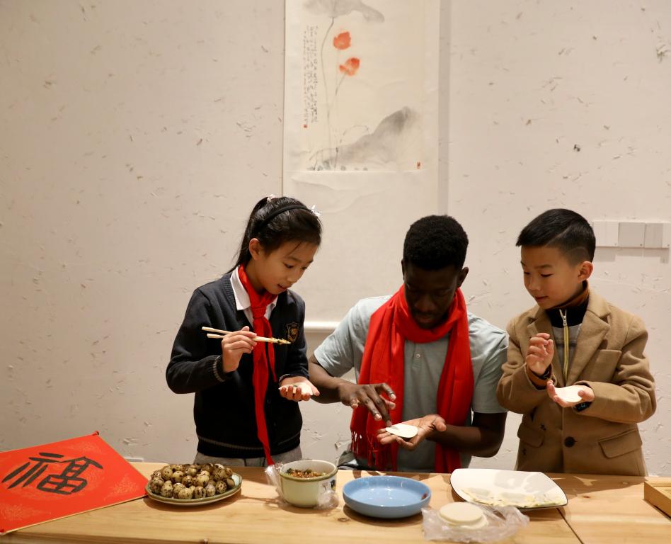 结对仪式后,小朋友的家庭与国际学生们展开分组活动,每组家庭带领一名国际学生体验自家的中国年,有的前往会展中心参观非遗年货展品尝麻糍、麦饼等当地美食,观看活字印刷术、细纹剪纸展览。有的漫步在历史文化街道五马街品尝麻花、冰糖葫芦等传统小吃,有的到永昌堡感受历史文化,欣赏古代建筑。有的则穿梭在温州的大街小巷体验最接地气的温州年。不仅如此,还有的小学生家庭与国际学生一起在家里包饺子、品茶道、学说温州话、挂春联、画面具等,他们把自己独特的过年方式展现出来与国家学生一起分享。来自尼日利亚的NOAH JUDE说,“中国有着丰富多彩的文化,这次活动让我了解了绘画、书法等传统文化,还学习了如何包饺子,这给了我一次了解美丽的温州文化和温州人的宝贵机会。”