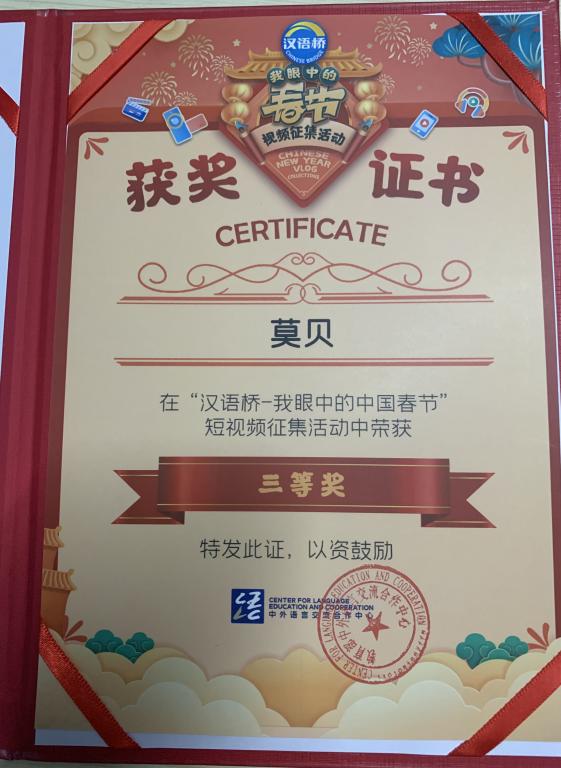 在刚刚结束的“汉语桥-我眼中的中国春节”短视频征集活动中,来自莱索托的2018级化学工程与工艺专业留学生莫贝(THIPANA MOPE)荣获三等奖。