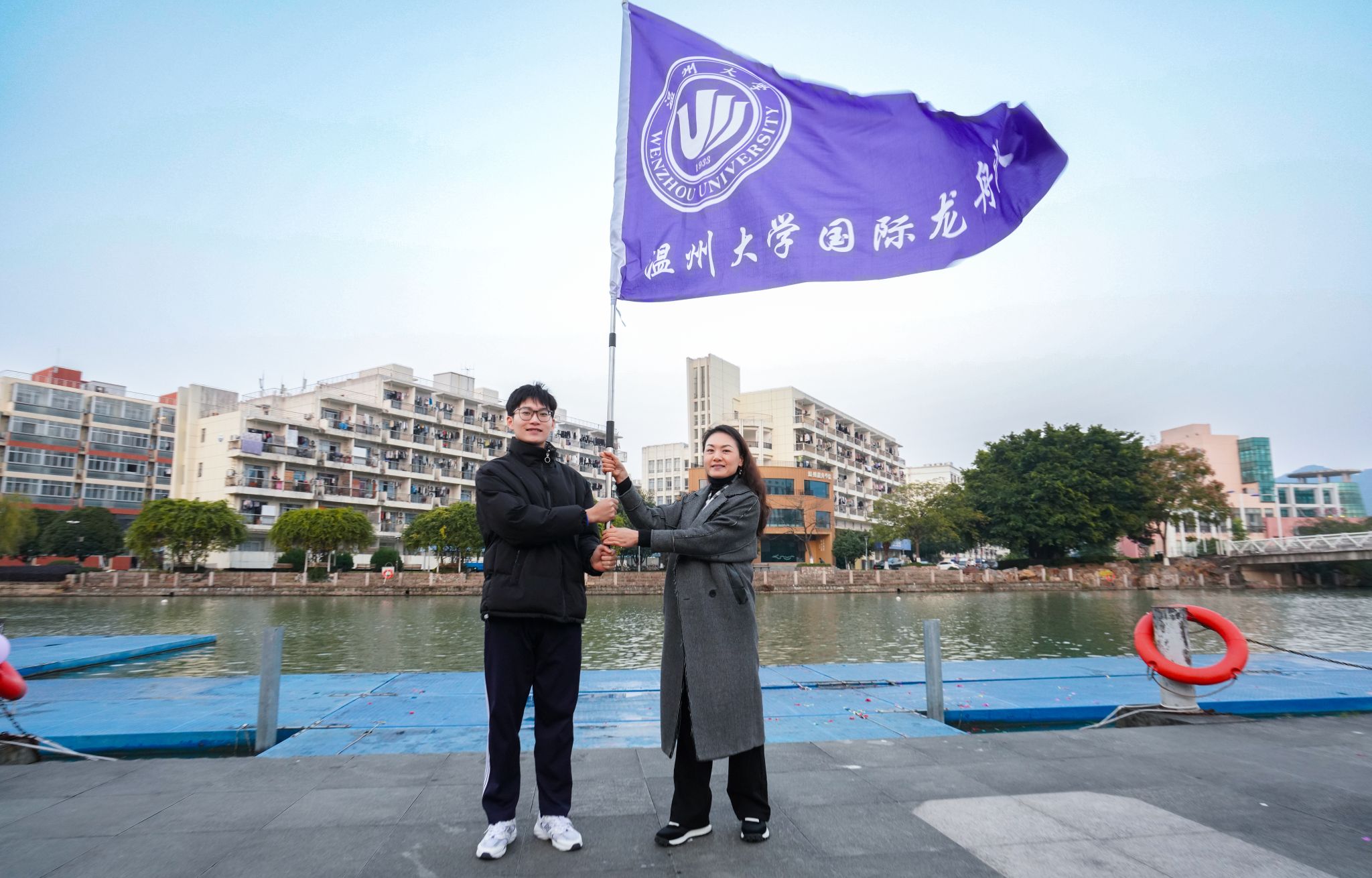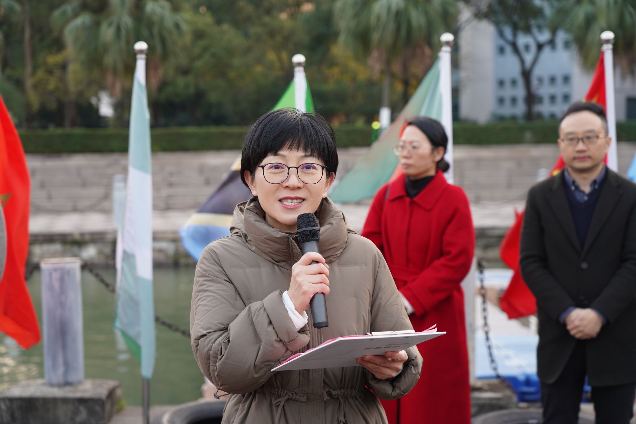 副书记李丽为国际龙舟队队长罗文达授旗。“划龙舟是一项非常有趣的活动,作为国际龙舟队的队长,我一定会肩负起这个责任,带领队员们认真训练,让每一次划桨都充满力量与激情,让更多人领略到中华龙舟文化的独特魅力”,来自越南的留学生罗文达接过手中的旗帜,激动地说道。
