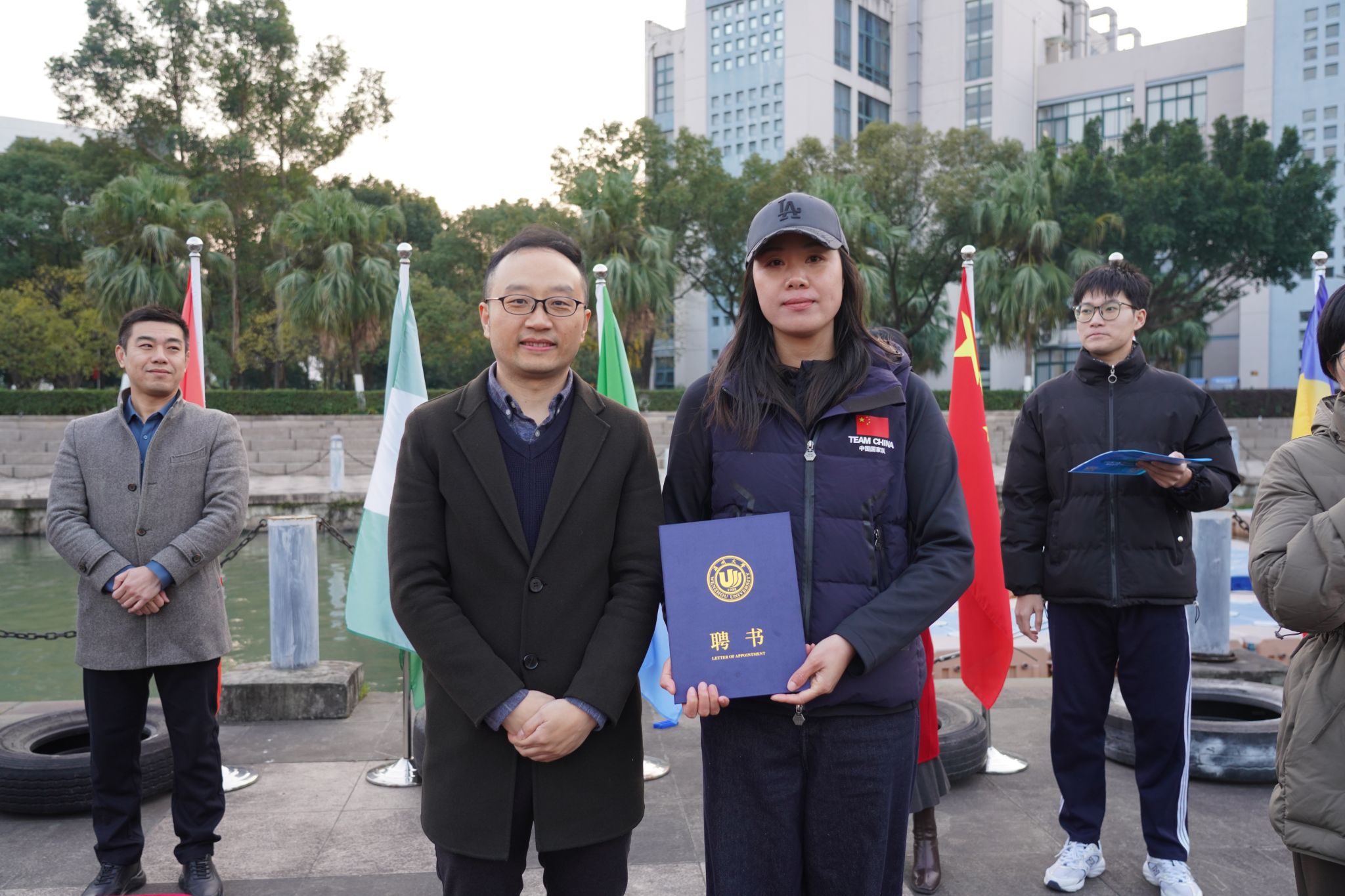 副书记丁强为朱敏圆教练颁发聘书,期待在朱教练的引领下,国际龙舟队能够乘风破浪、奋勇争先。